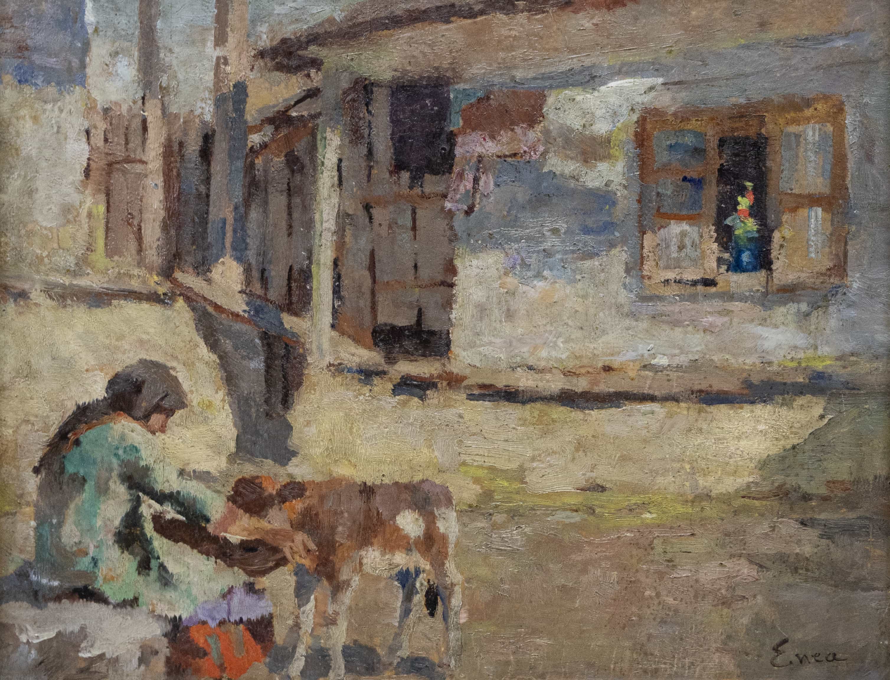 07.41 Nicu Enea (1897-1960) - "În ogradă", ulei pe carton, 38x49cm, semnat dreapta jos cu brun