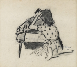 07.03 Ion Popescu Negreni (1907-2001) - "La masă", cărbune, 30x34.5cm, semnat dreapta jos cu negru, lucrarea este reprodusă în Albumul Ion Popescu Negreni, ed.Meridiane 1989, pg.36, provine din colecția Boris Paraschivescu