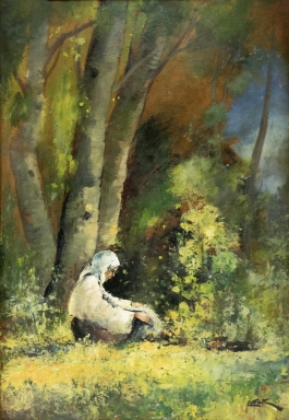 07.25 Coman Ardeleanu - "Țărancă în iarbă", ulei pe carton, 70x49cm, semnat dreapta jos cu negru