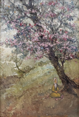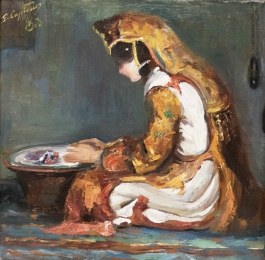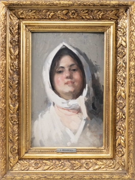 07.48 Nicolae Grigorescu (1838-1907) - "Tânără cu basma albă", ulei pe lemn, 35x23.5cm,semnat dreapta jos cu rosu, datat 1895, lucrarea a participat la expoziția Nicolae Grigorescu - Maestrul de la Câmpina, Muzeul Național Cotorceni, 22 iunie-15septembrie 2006 și este reprodus în catalogul expoziției la poz.39. Catalogul inclus |