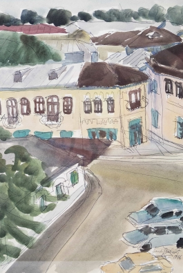 07.05 Sanda Șărămăt (1927-2023) - "Peisaj citadin", tuș și acuarelă, 41x28.5cm, semnat dreapta jos cu creionul, datat 1976