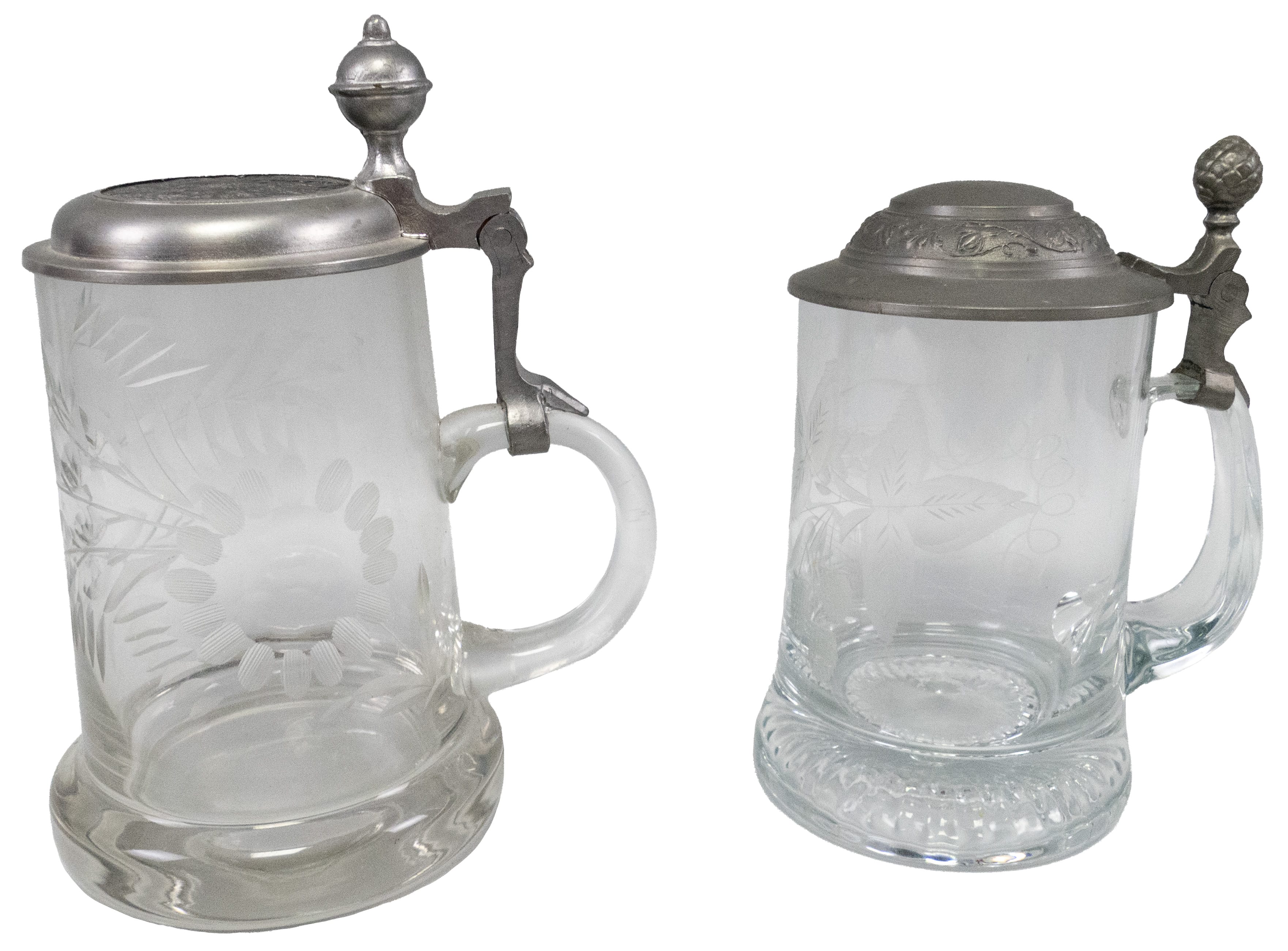 05.05 Două halbe, cristal și metal, decor cu flori incizate, H 1516cm