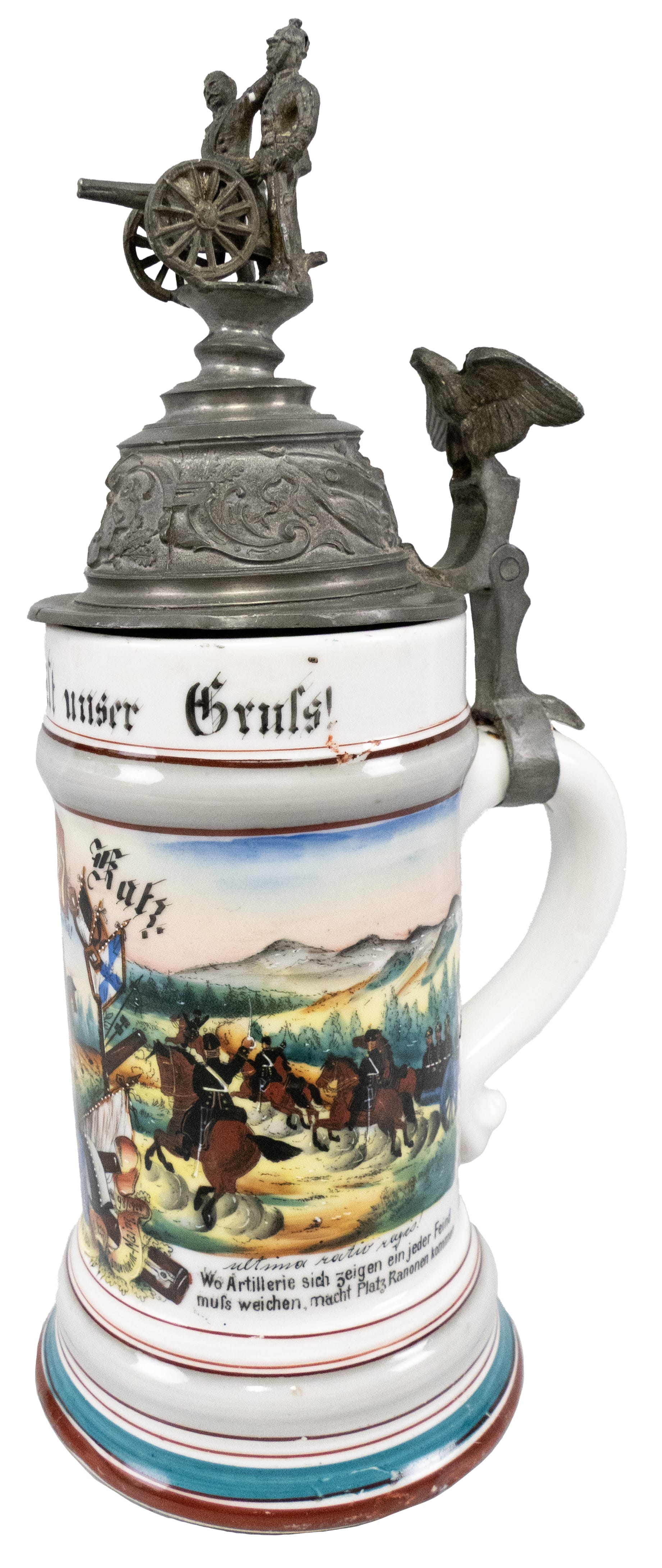 05.07 Halbă de bere jubiliară (omagiu pentru artileriști), metal și faianță, pictură si decor manuale, H 29cm, Germania, perioada interbelică