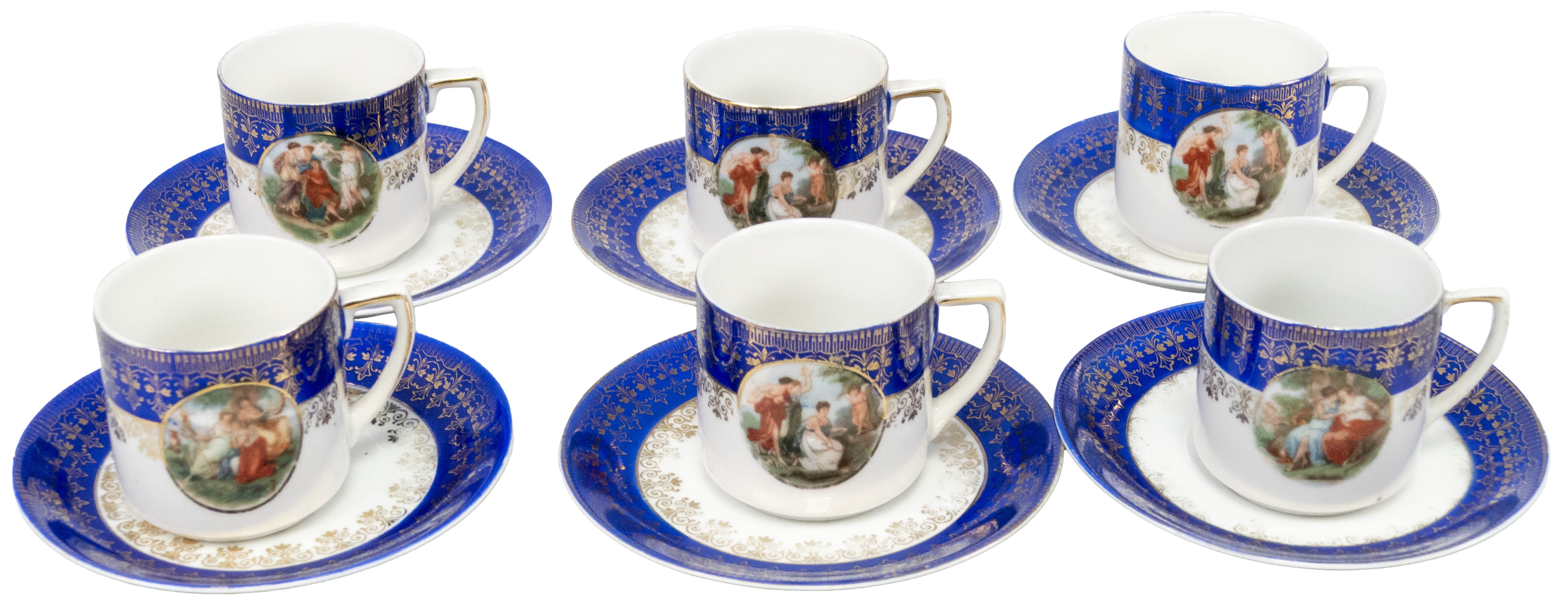 05.20 Șase cești cu farfurii pentru ceai/ cafea, porțelan decorat cu personaje (în medalion), aur și cobalt, marcate Czechoslovakia, perioada interbelică, mic defect la farfurie