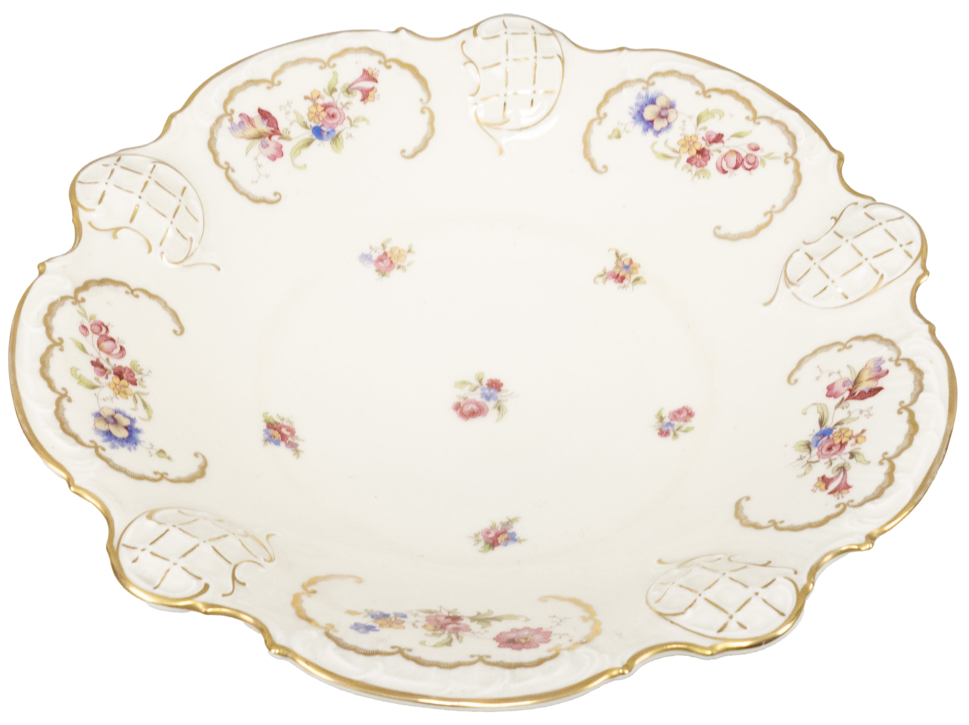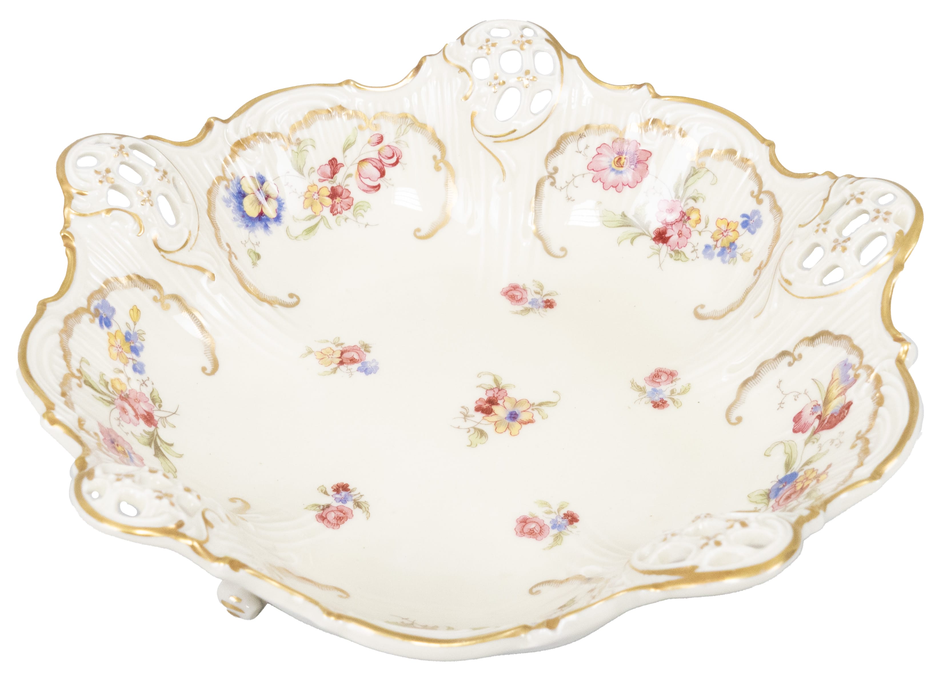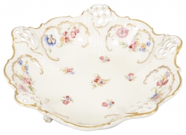 05.04 Fructieră bol, trei piciorușe, bordură lobată, porțelan traforat, decorat în relief cu flori și aur, marcată Rosenthal, dia.24cm, perioada interbelică