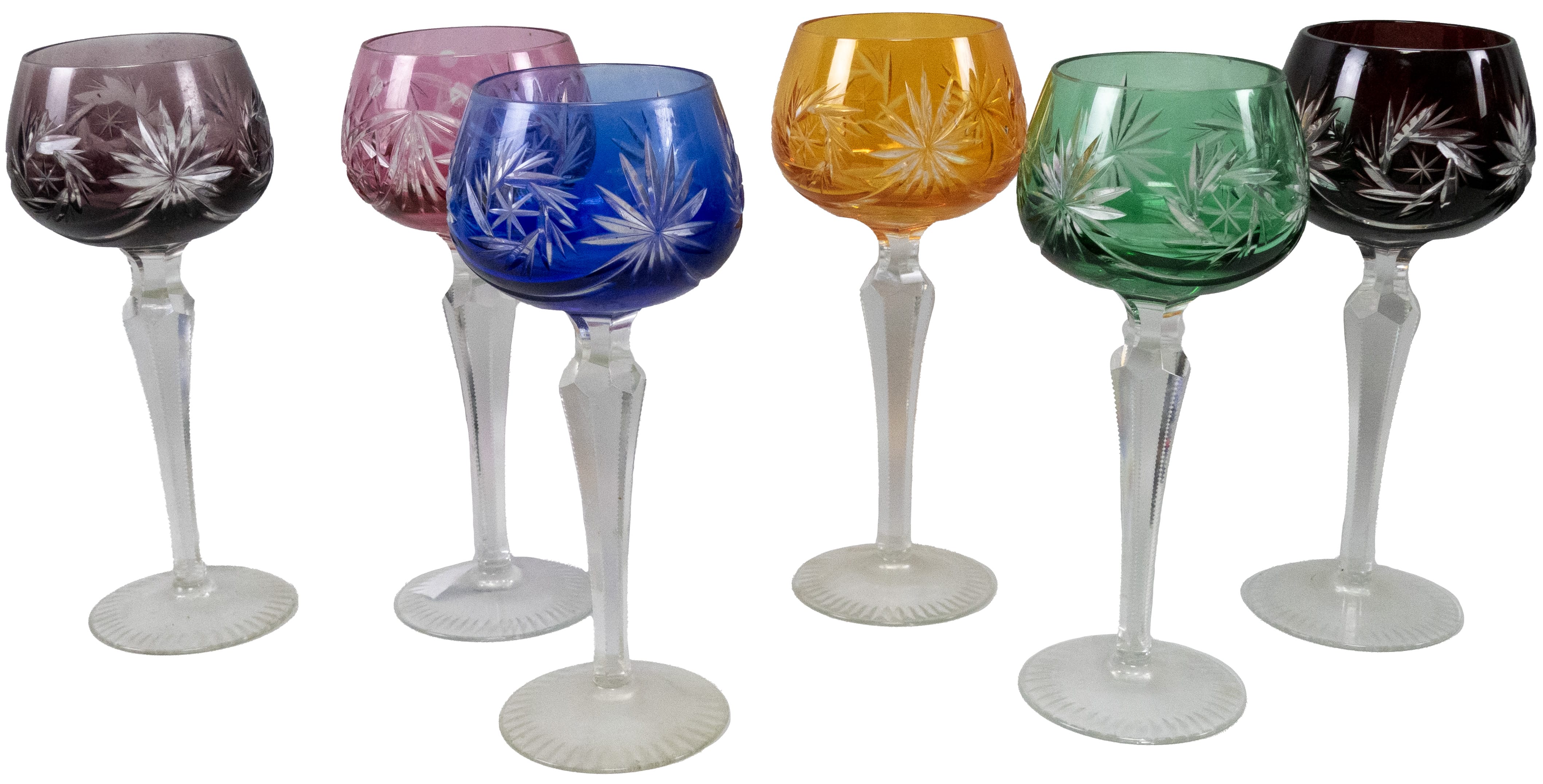 05.08 Șase pahare pe picior, cristal colorat, H 19.5cm, a II-a jum.sec.XX, un pahar cu decor diferit