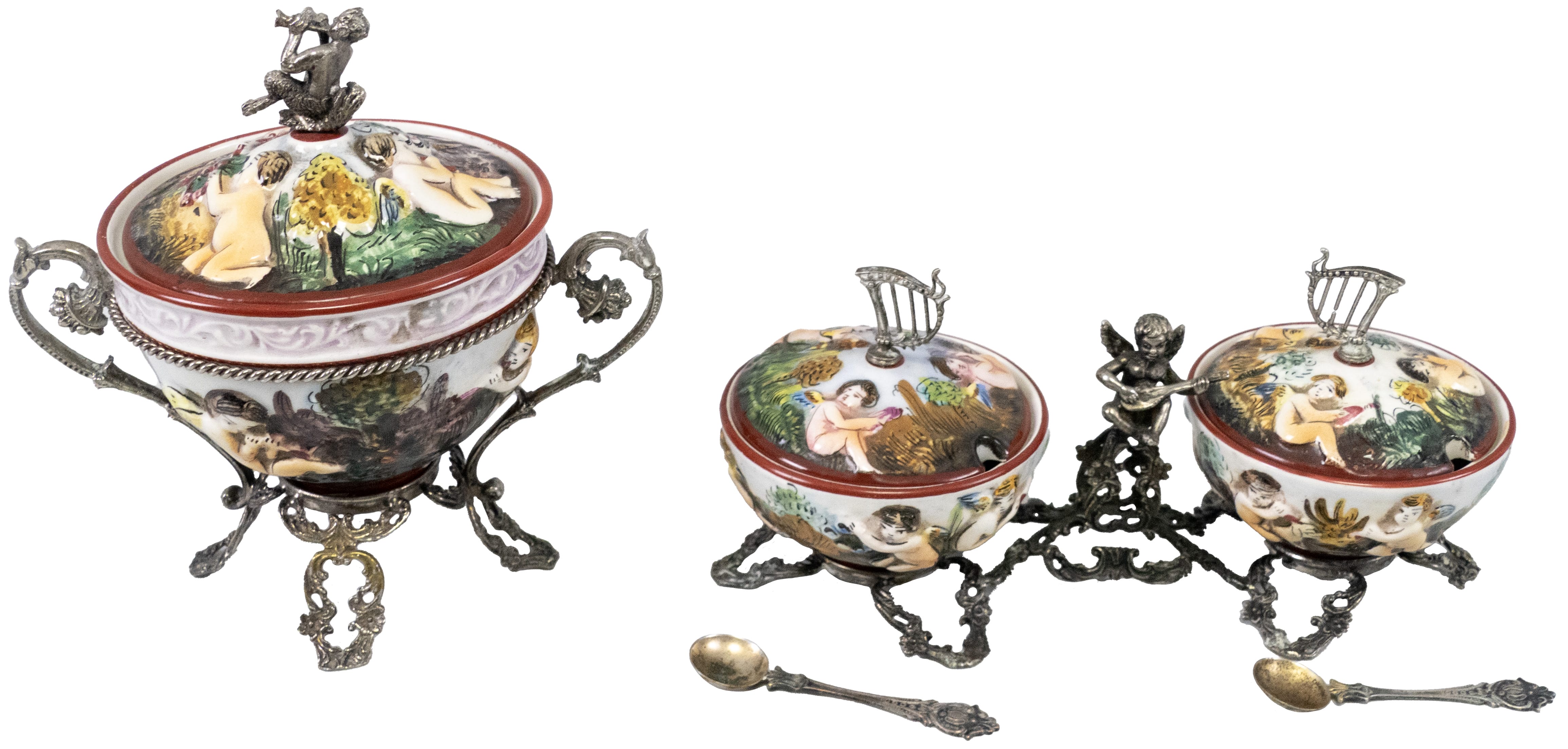 05.11 Solniță dublă și zaharniță, porțelan decorat în relief cu îngerași, pictat, pe suporturi metalice, Italia(?), a II-a jum.sec.XX