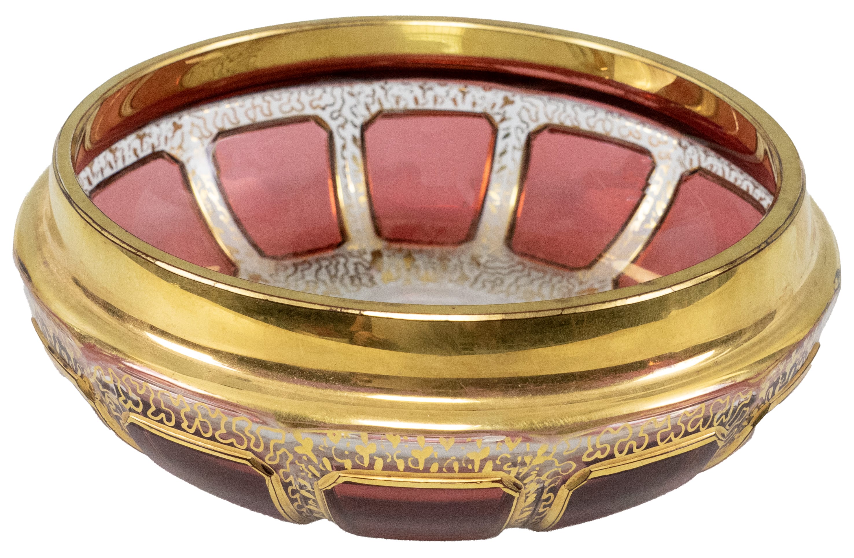 05.13 Bol, cristal colorat, pictat cu aur, decor geometric, model Egermann, dia 13cm, peioada interbelică