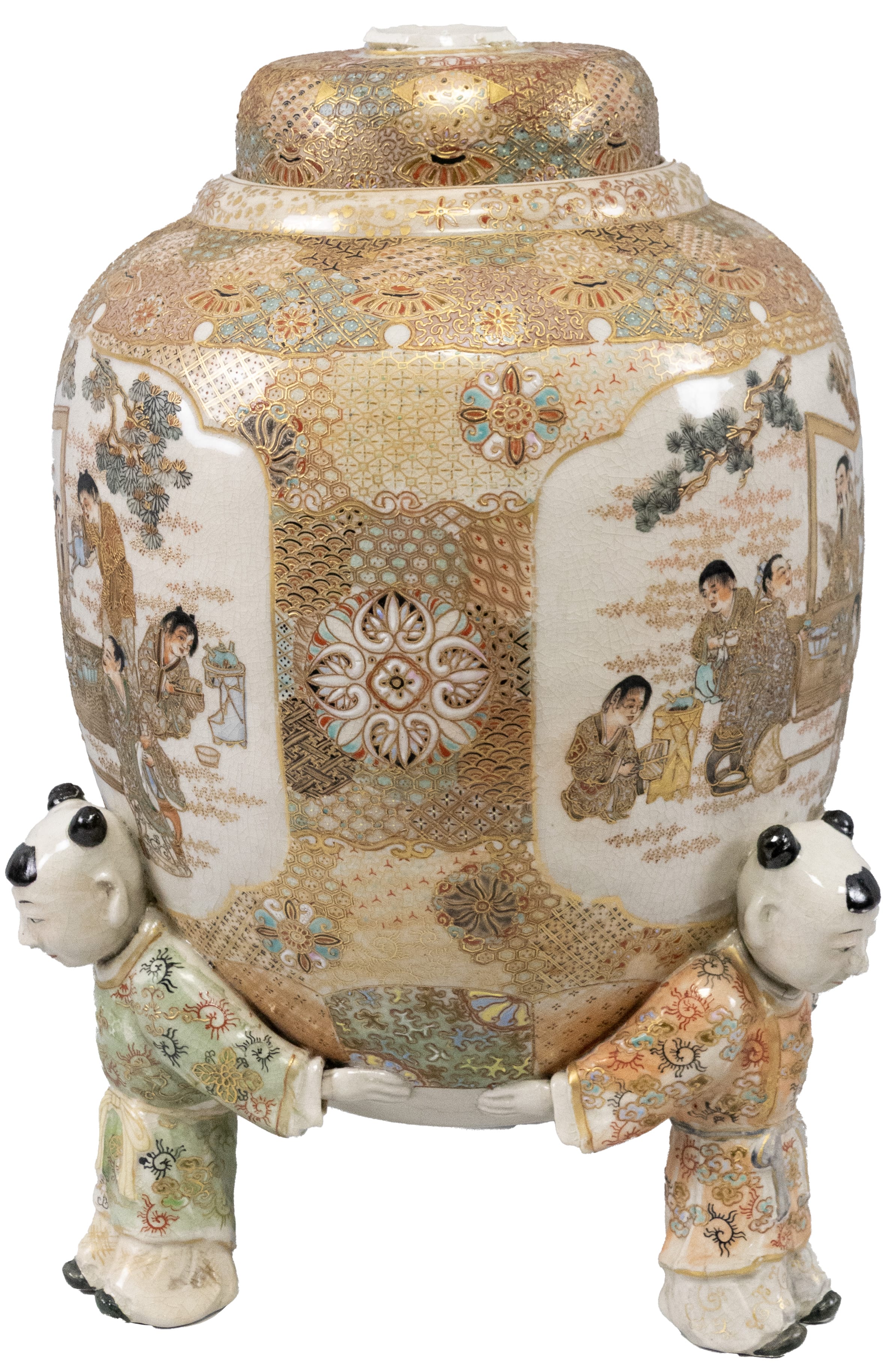 05.16 Vas ornamental, cu capac, trei piciorușe, ceramică pictată (tehnică Moriage) cu email și aur, decor cu personaje și păsări, H 39cm, Japonia, cca.1900, ornament rupt la capac