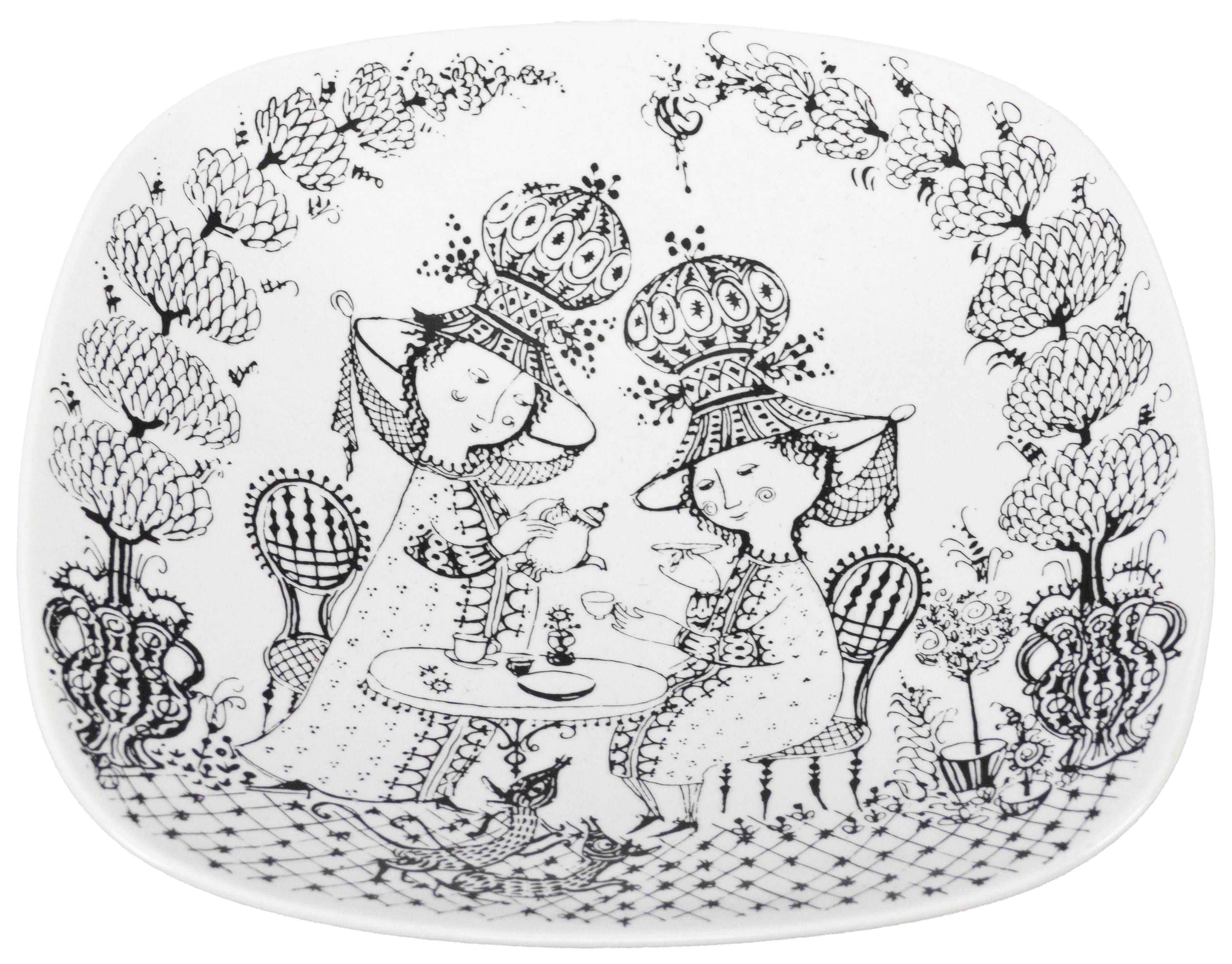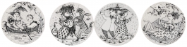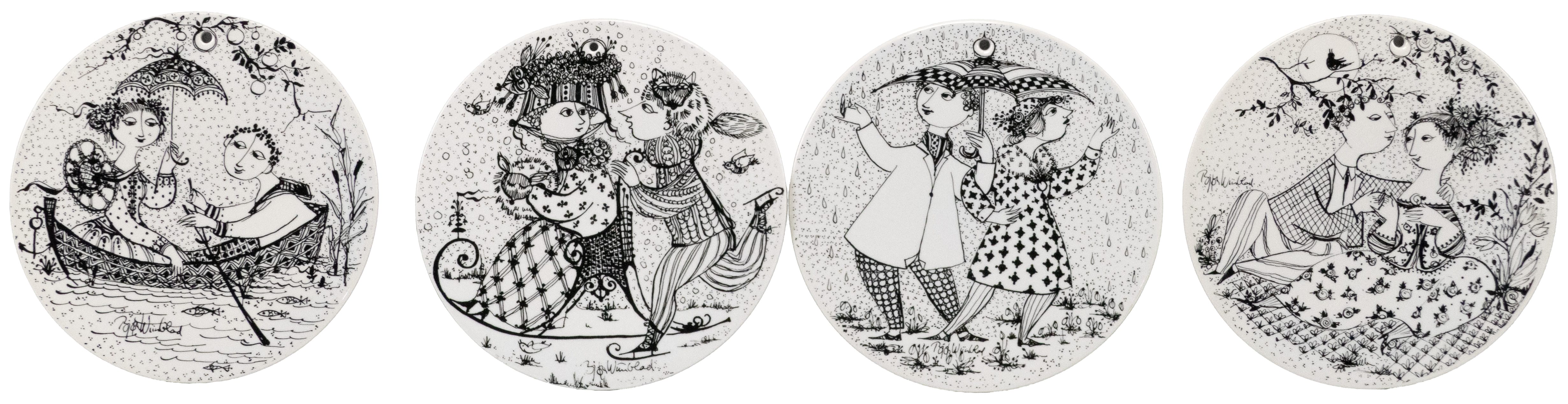 05.18 Patru farfurii ornamentale (din ciclul anotimpurilor), porțelan decorat cu personaje, pictate cu email, marcate Rosenthal, semnate Bjorn Wiinblad, dia.15cm, a II-a jum.sec.XX, ambalaj original