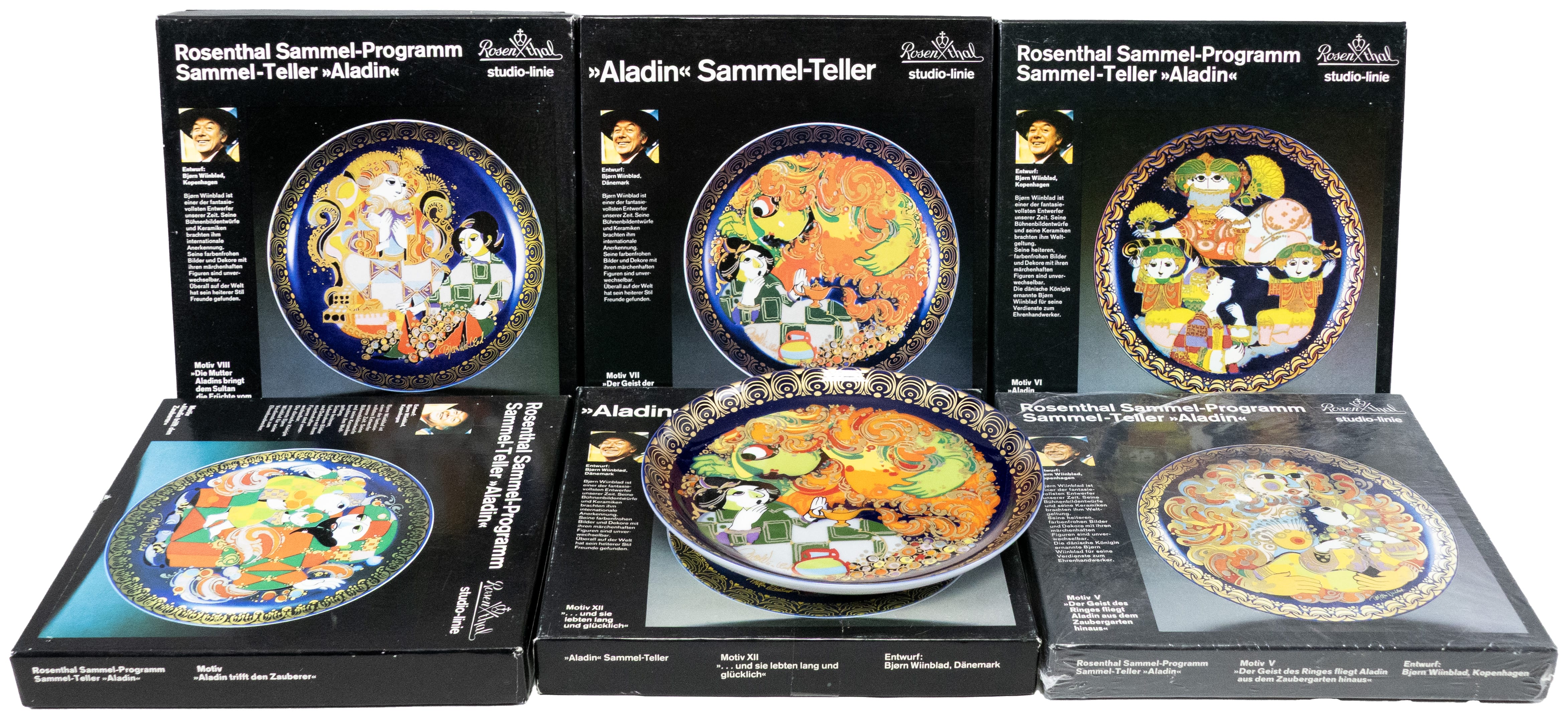 05.20 Șase farfurii ornamentale, decorate cu scene și personaje din basmele lui Aladin, porțelan marcat Rosenthal, semnate Bjorn Wiinblad, dia.16,5cm, a II-a jum.sec.XX