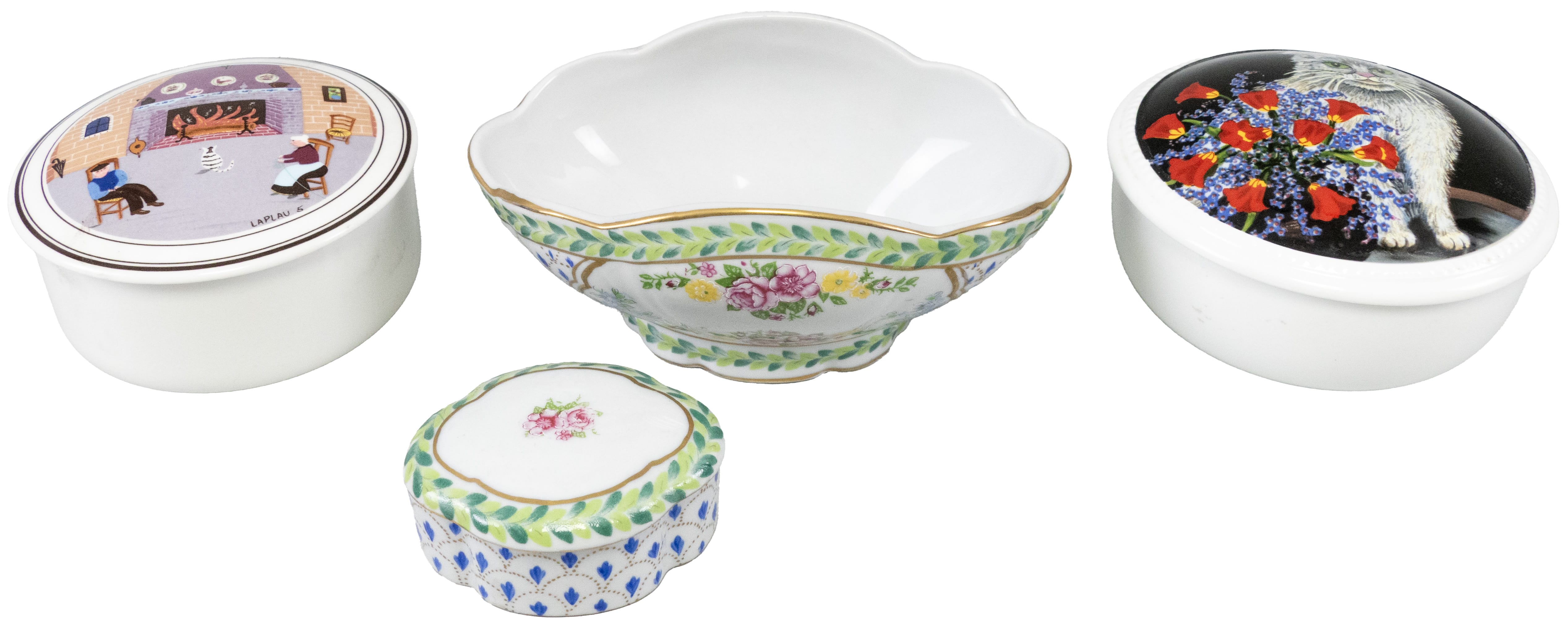 05.21 Bol și trei casete cu capac, porțelan pictat (trei piese), marcate Elios și Villeroy Boch, H 7cm, dia.10/12cm, 7x6cm, jum.sec.XX