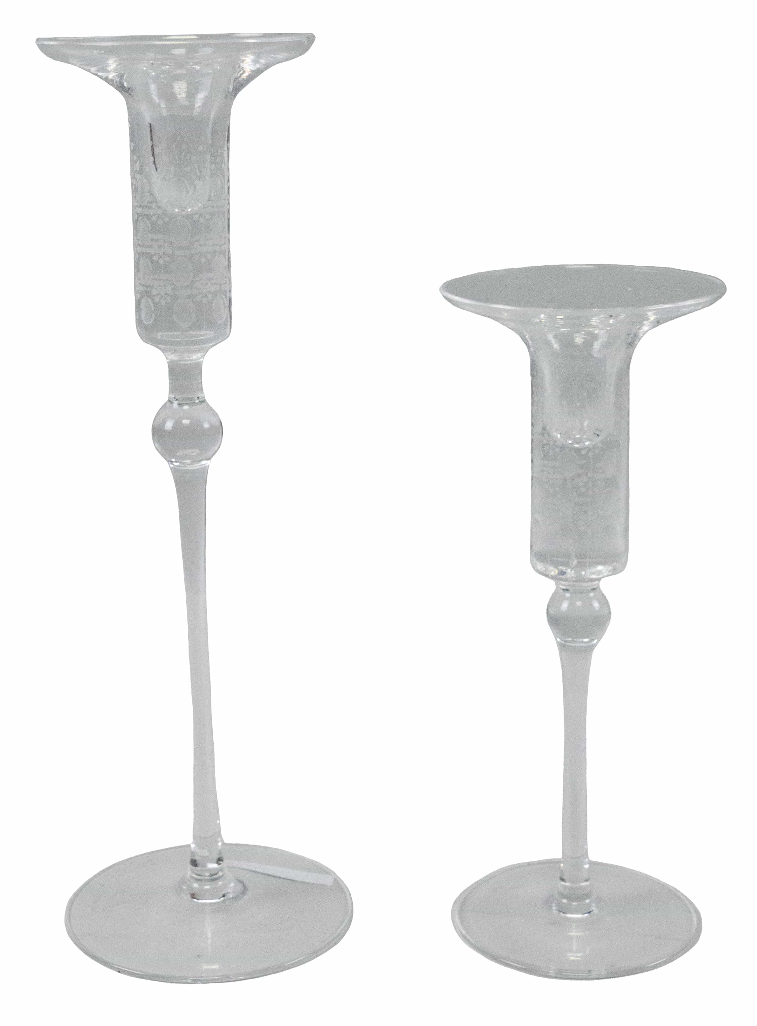 05.04 Două sfeșnice cu o lumină, cristal gravat, marcate Rosenthal, H 25/18cm, jum.sec.XX, mic defect