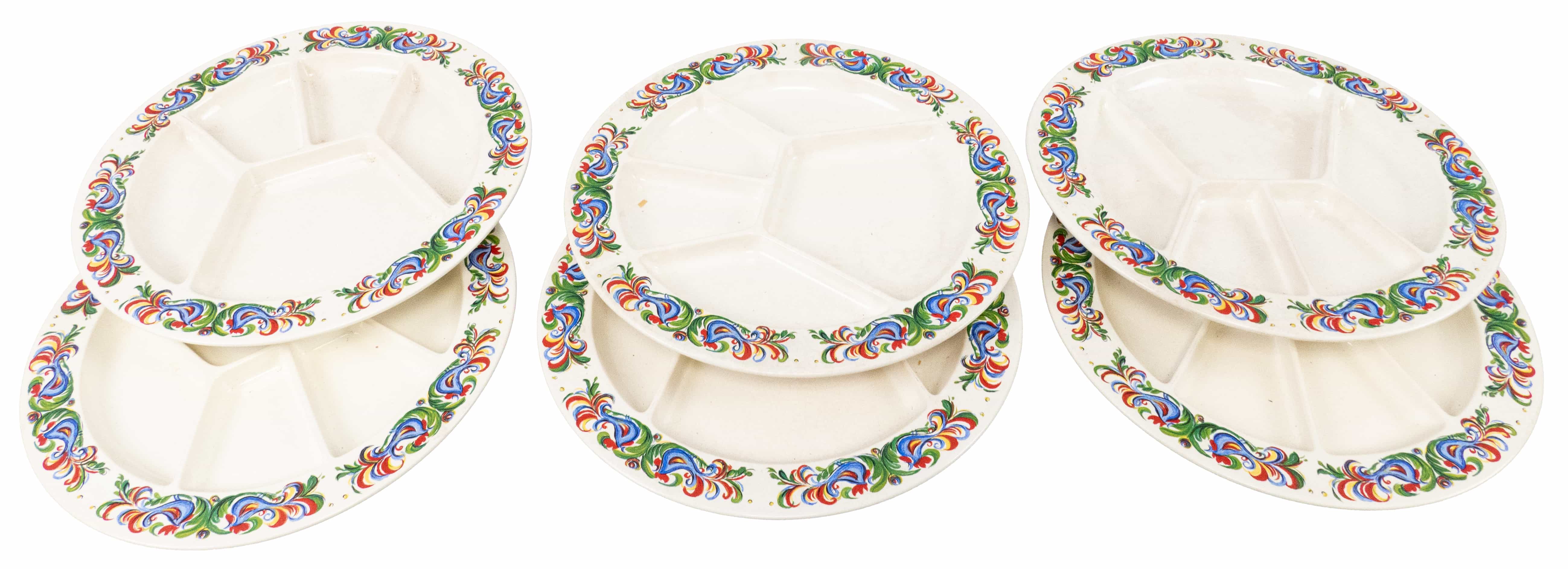 05.05 Șase platouri, cinci compartimente, pentru aperitive, ceramică pictată cu email, marcate Villeroy&Boch, dia. 26cm, perioada interbelică