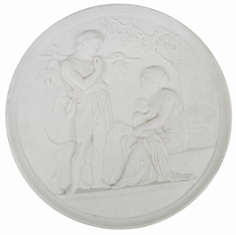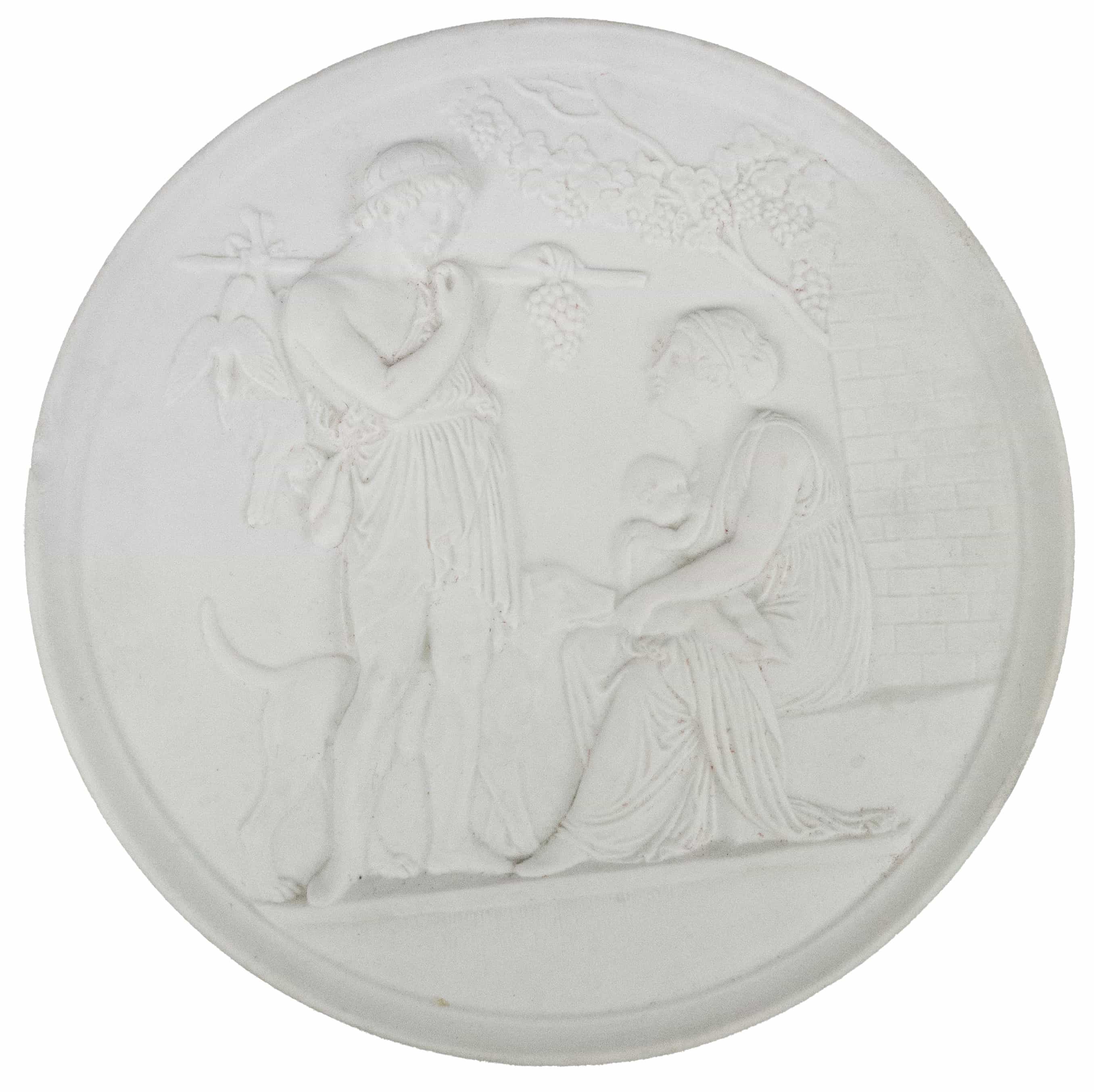 05.06 Scenă biblică, piesă ornamentală de perete, porțelan biscuit, marcat, dia.14,5cm, a II-a jum.sec.XX, mic defect pe contur
