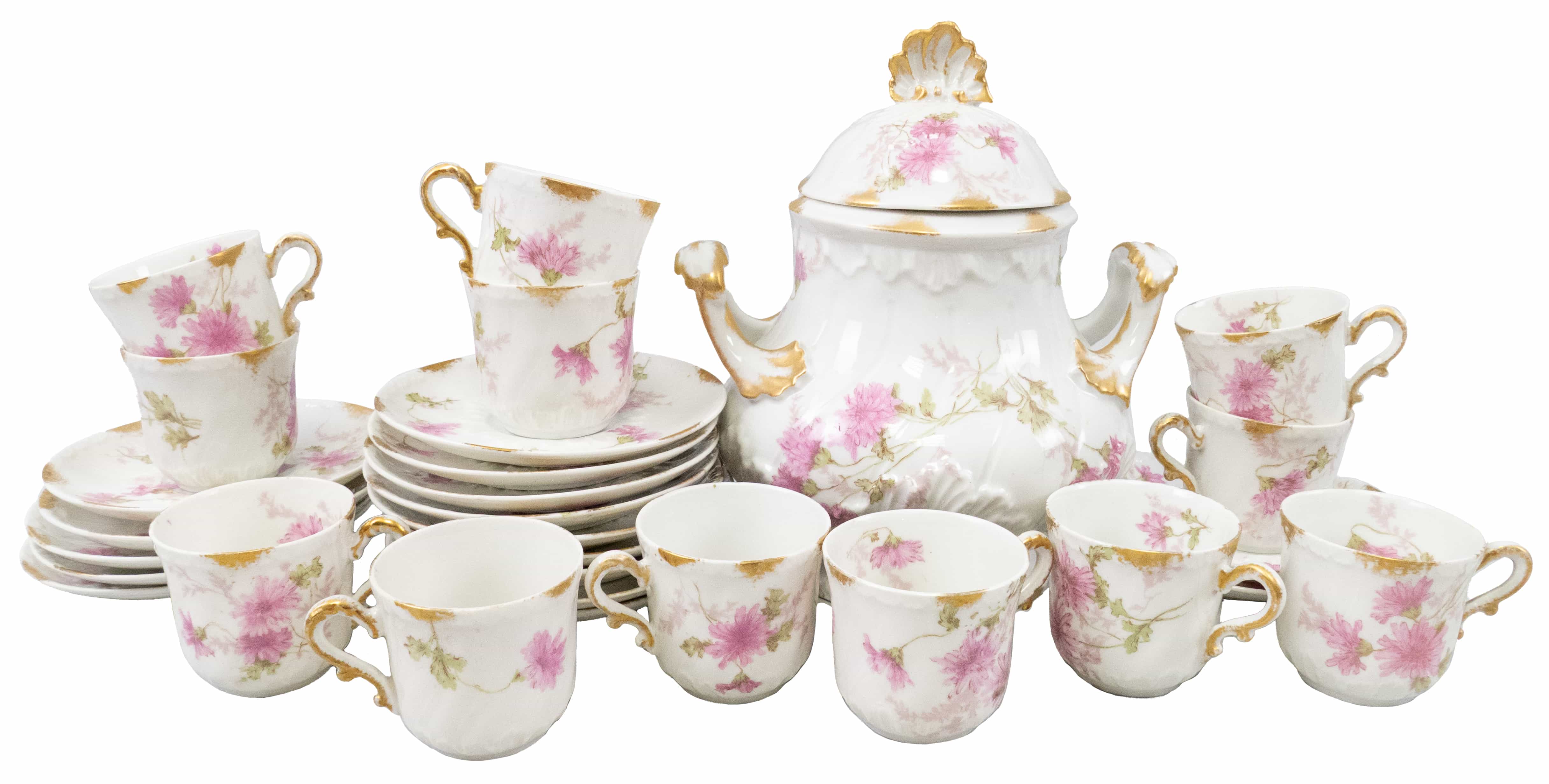 05.07 Douăsprezece cești cu farfurii și vas cu ansă și capac, porțelan pictat cu flori și aur, marcat G.D.A France (Limoges), 1901/1945