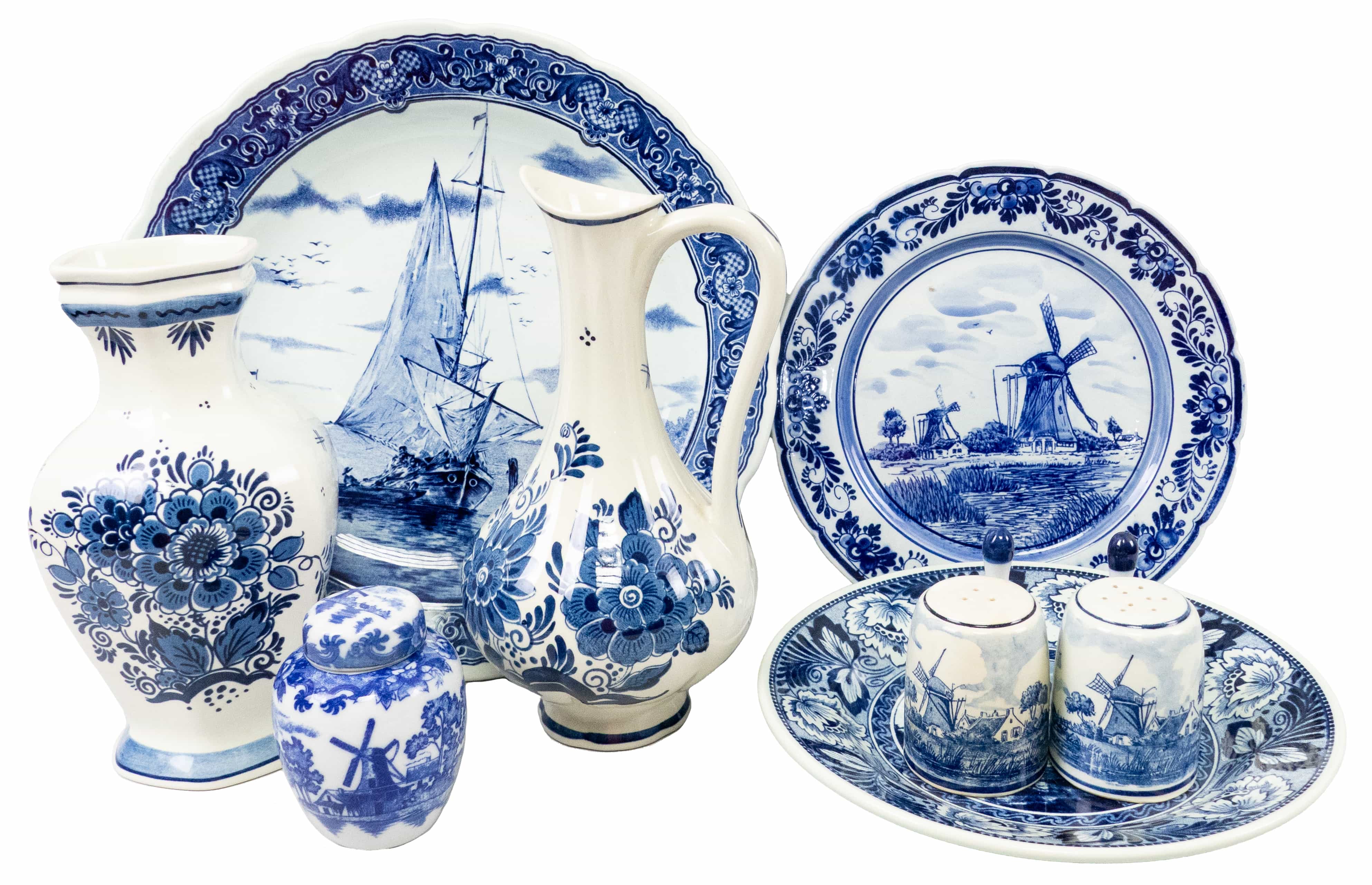 05.11 Set: carafă, vas pentru flori, două solnițe, doi clopoței, vas cu capac, trei platouri (10 piese),ceramică pictată cu cobalt, marcate Delft Holland, a II-a jum.sec.XX, defecte la clopoței
