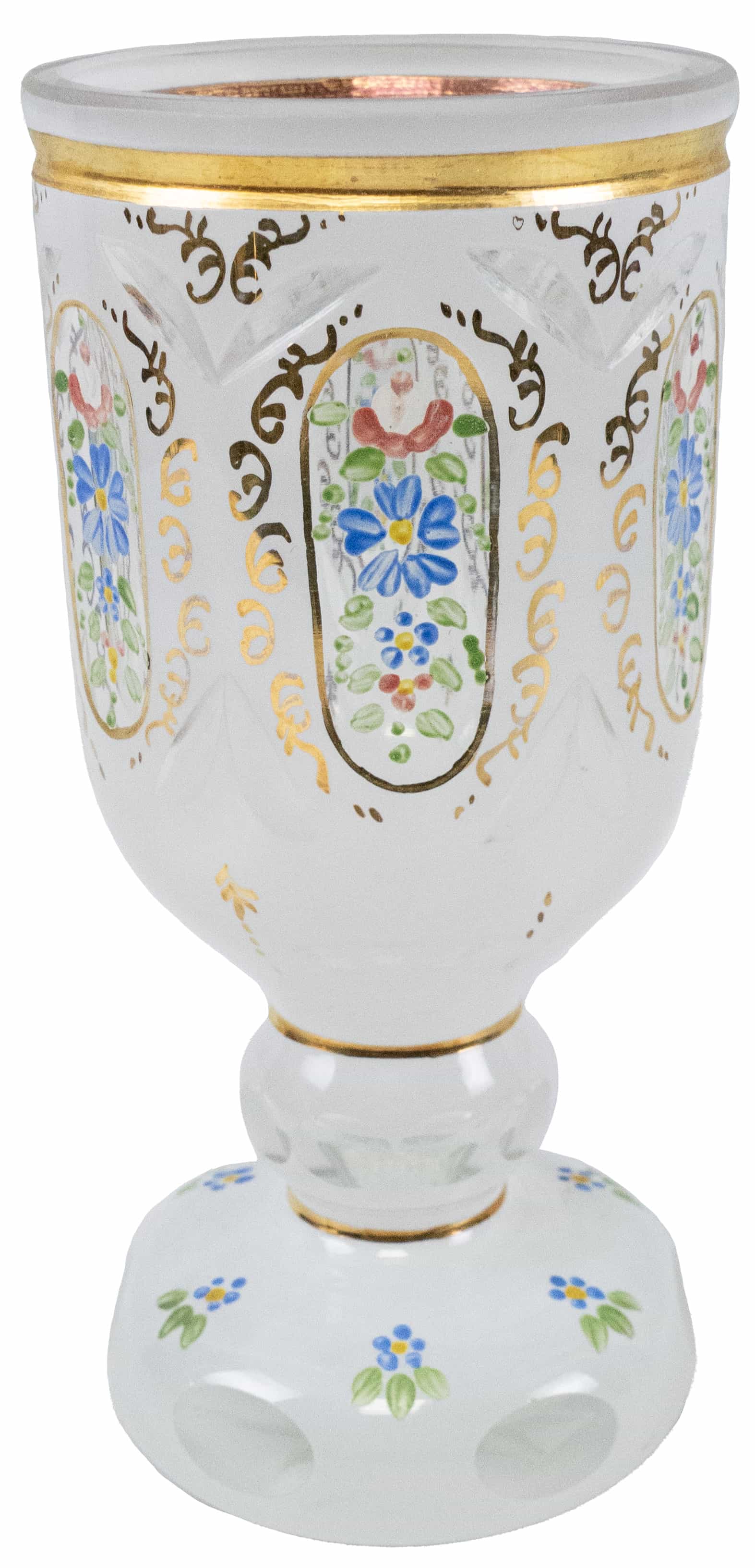 05.14 Pahar, picior central, cristal fasetat, aplicație de email și aur, H 16cm, jum.sec.XX