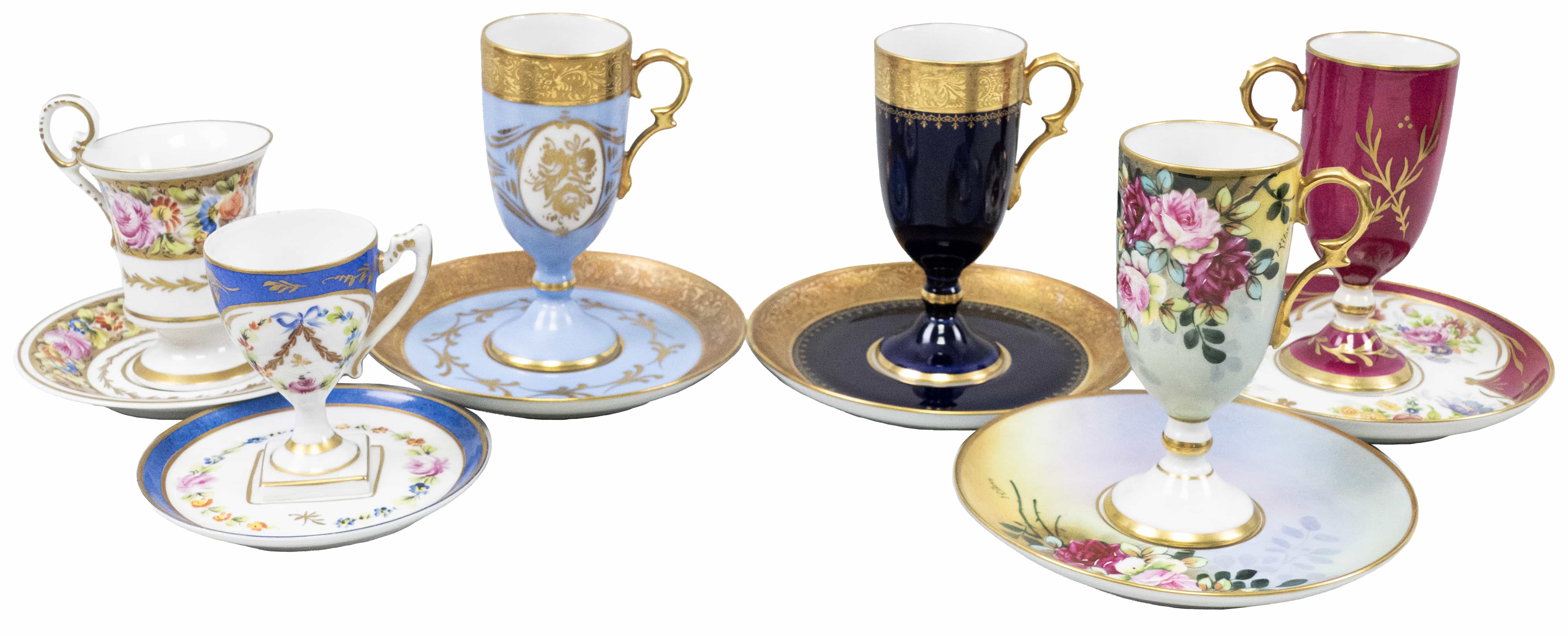 05.15 Șase cești pe picior cu farfurii, porțelan pictat, decorat cu aur, marcate Limoges France, unele semnate (Giraud), H 12cm, a II-a jum.sec.XX