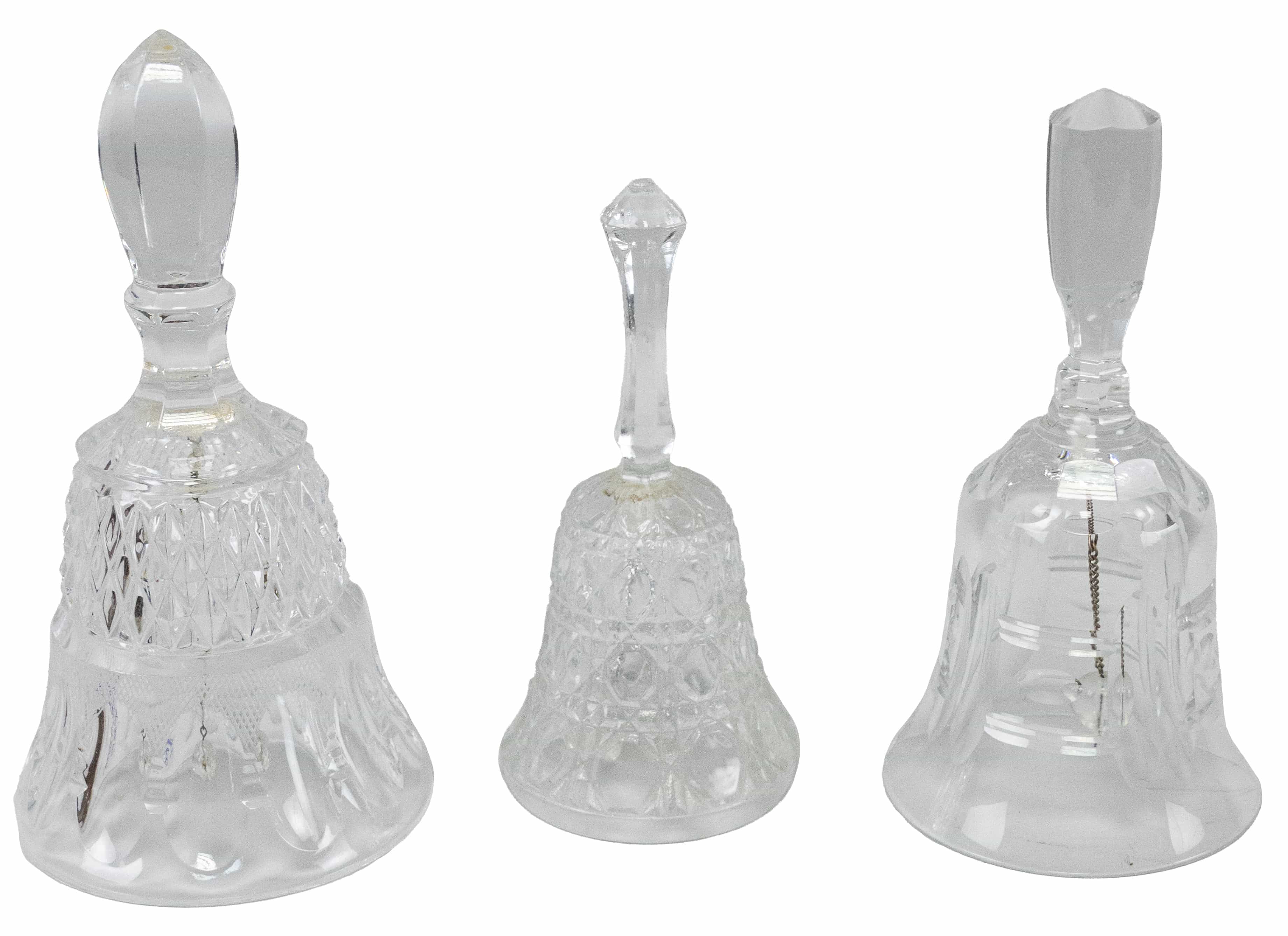 05.17 Trei clopoței (2+1), cristal gravat, fasetat, gravat și sticlă, H 17cm, înc.sec.XX, un clopoțel cu mici defecte