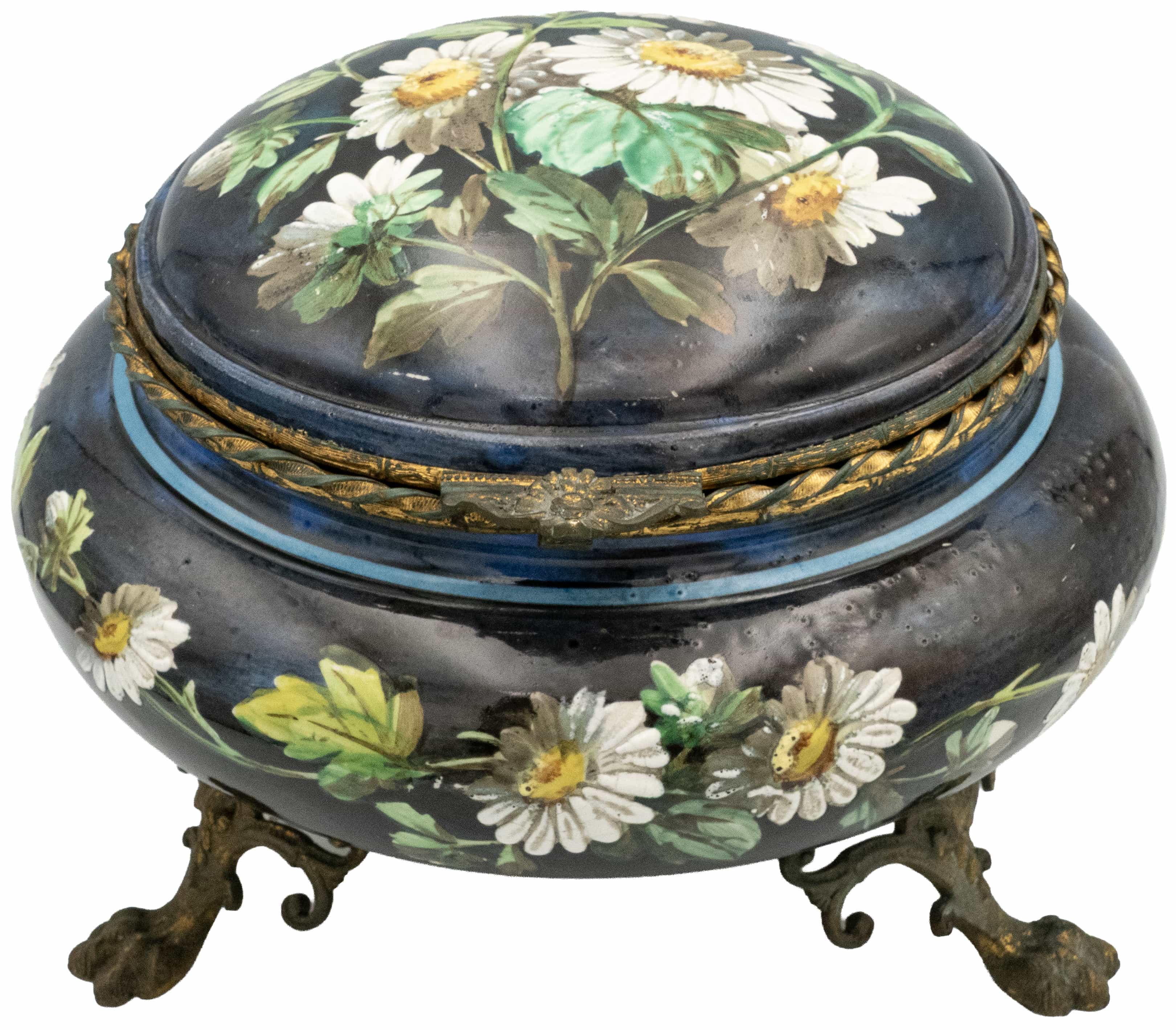 05.02 Casetă rotundă cu capac, ceramică pictată cu email, trei piciorușe, montură bronz, dia.21cm, H 16cm, înc,sec,XX