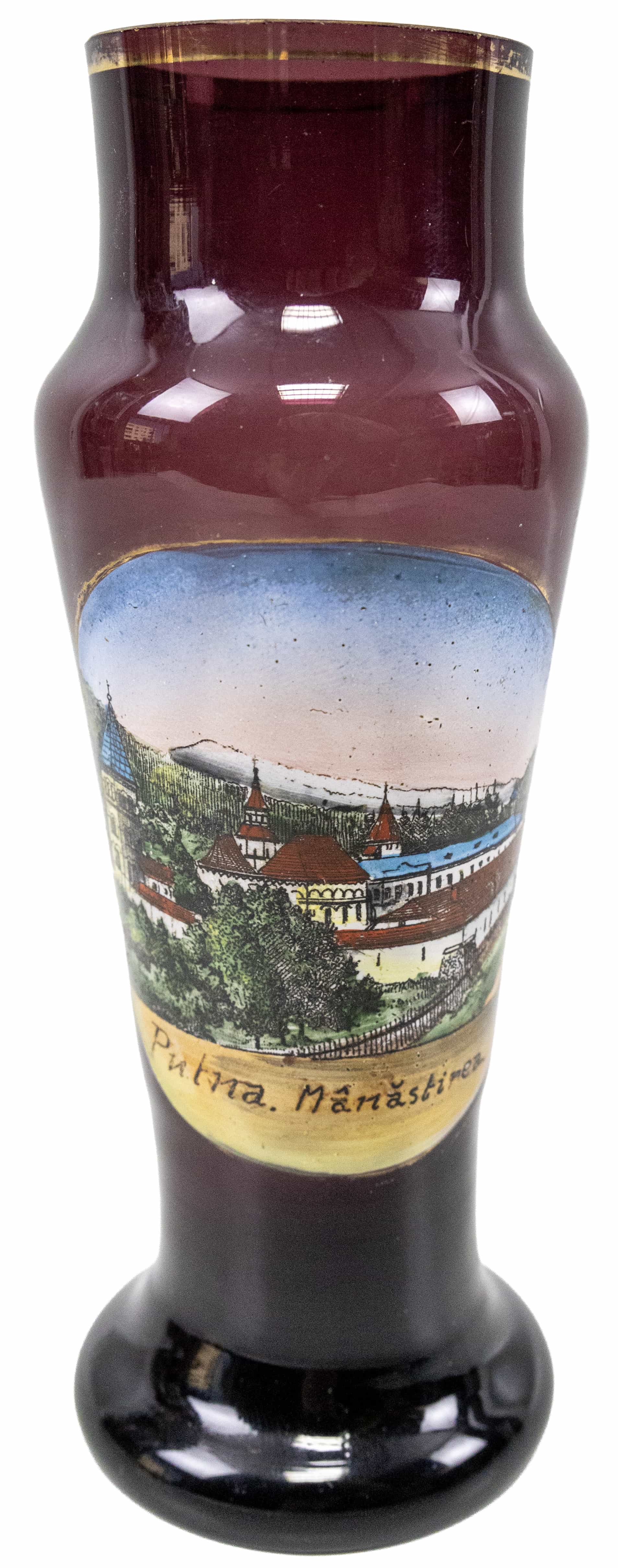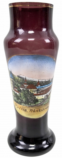 05.06 Vas ornamental, decorat cu mânăstirea Putna, sticlă colorată, aplicații de email și aur, H 15.5cm, înc.sec.XX