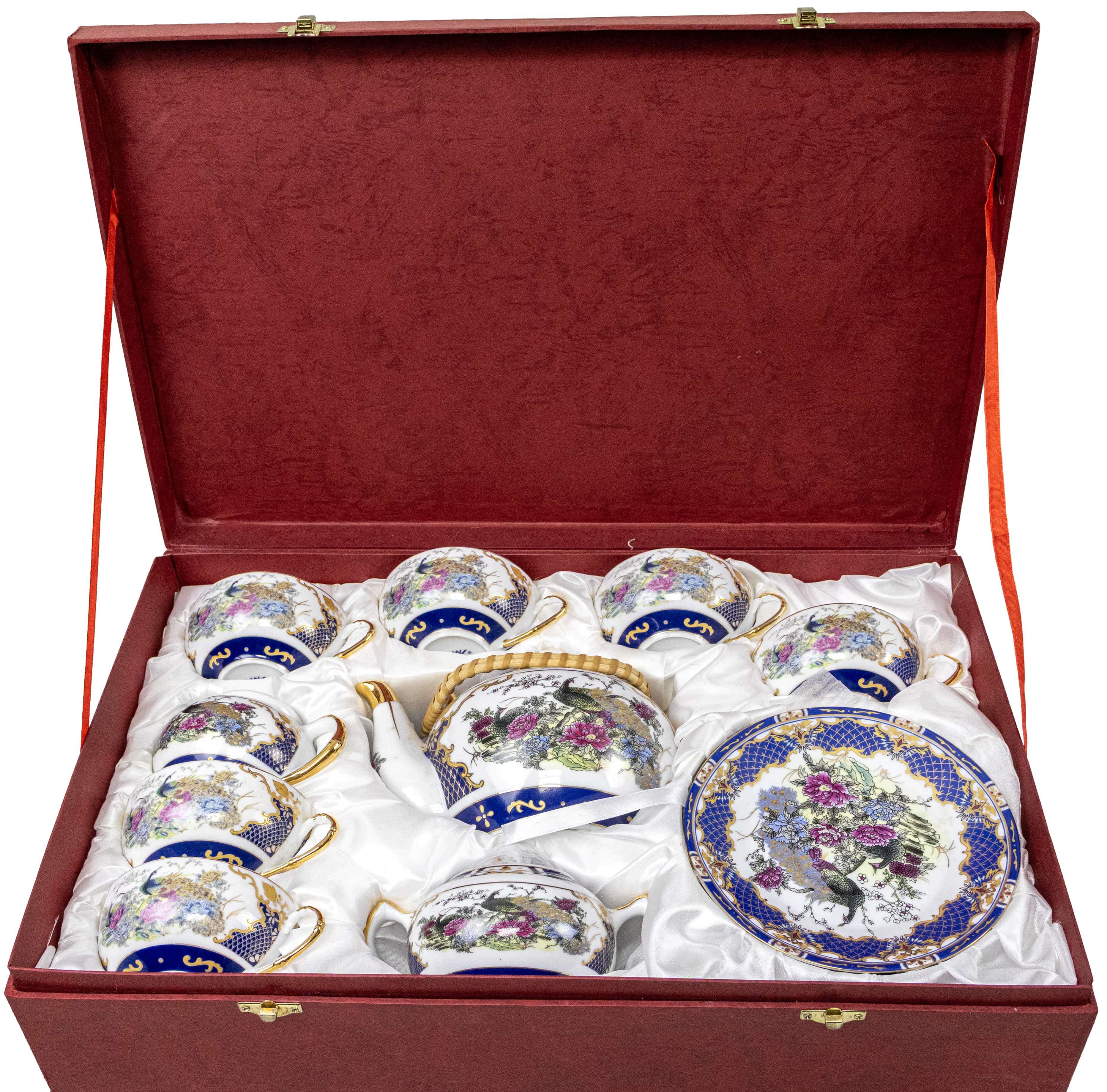 05.07 Serviciu de ceai: șase cești cu farfurii, trei piese pentru servit, porțelan decorat cu aur, marcate, China, a II-a jum.sec.XX, în casetă originală