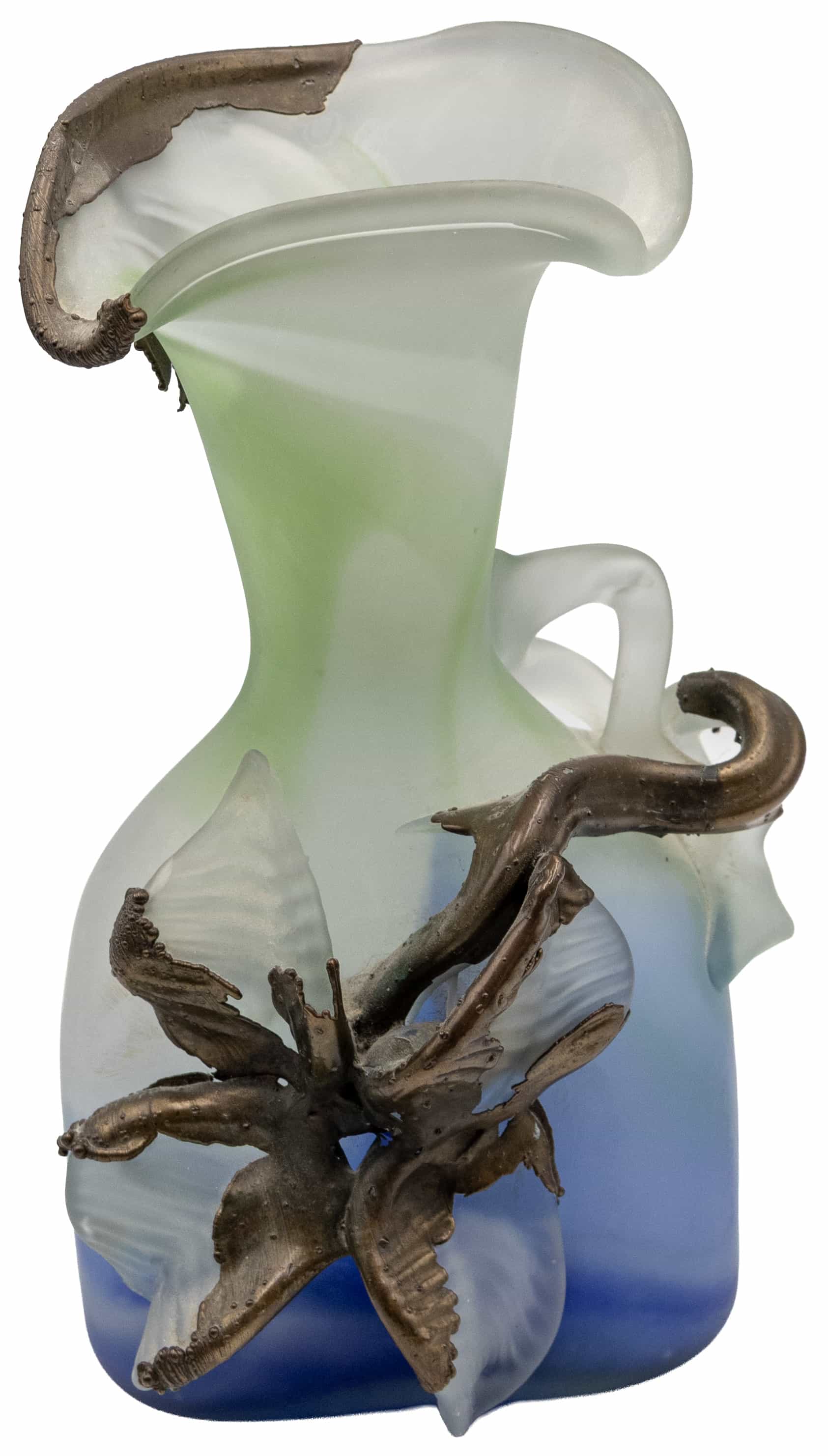 05.08 Vas ornamental, sticlă colorată, aplicații de sticlă și bronz, semnat D Băncilă, H 23.5cm, a II-a jum.sec.XX