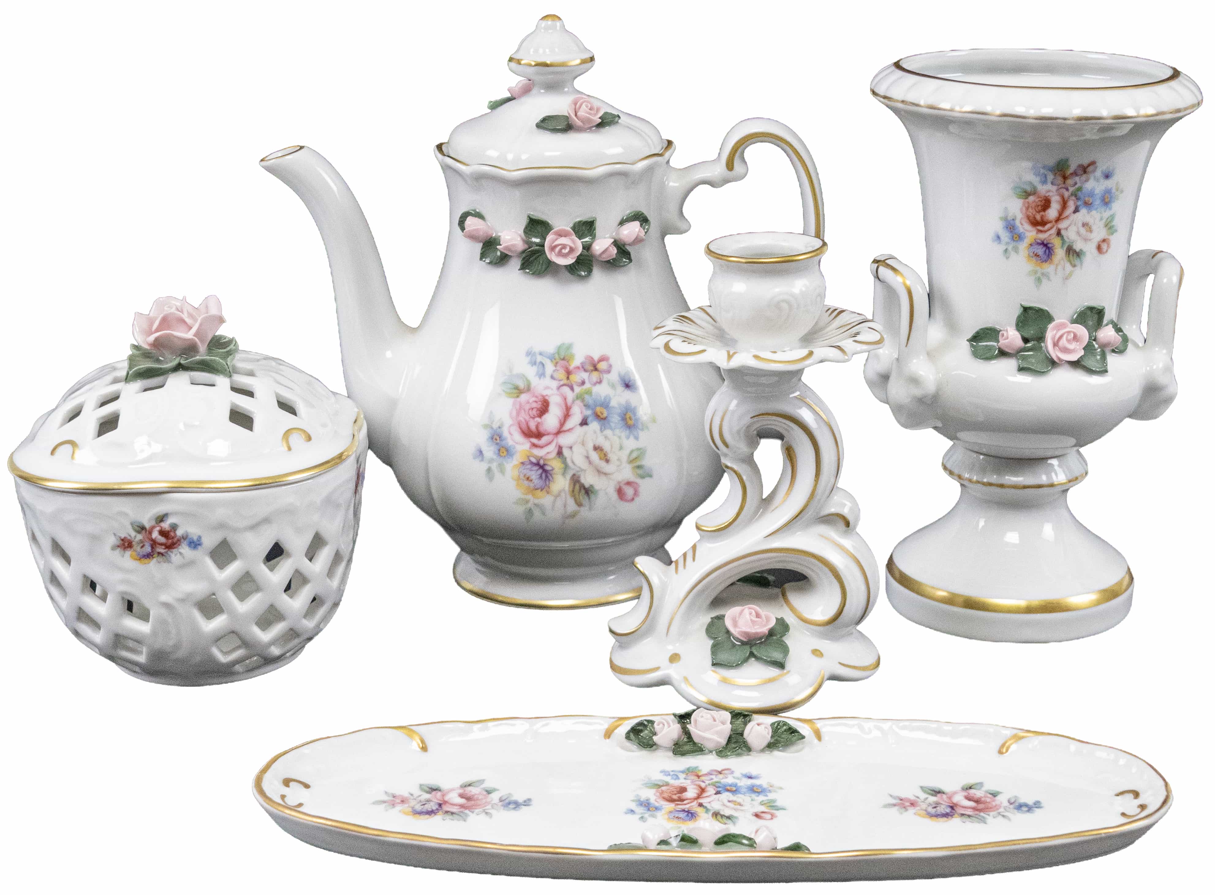 05.14 Cinci piese: ceainic, casetă cu capac, sfeșnic, vas ornamental și platou oval, porțelan decorat, aplicații de pastă, marcate, Tettau-Bavaria, a II-a jum.sec.XX
