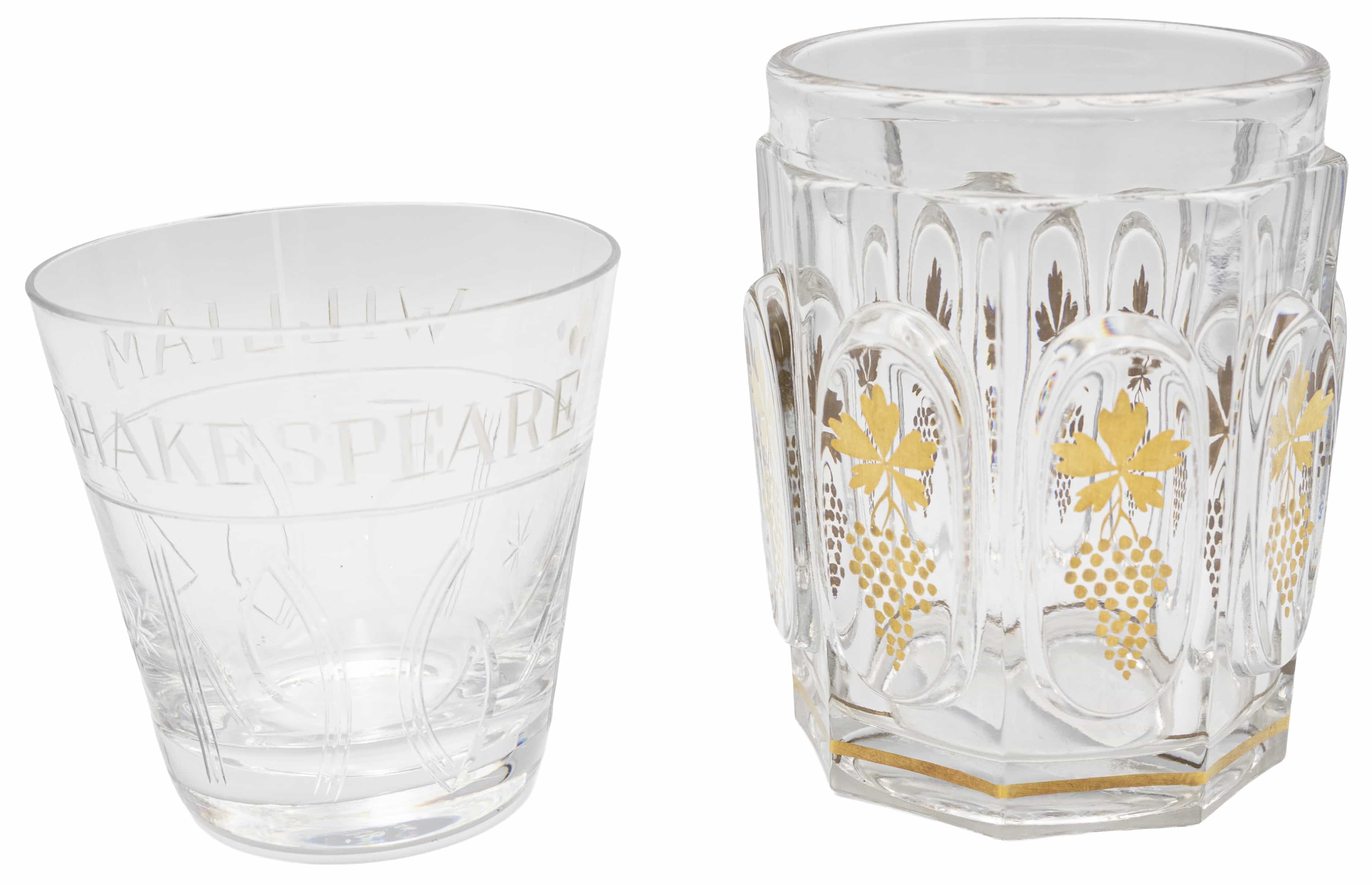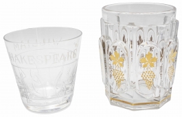 05.15 Pahar aniversar (1564-1964 Shakespeare) si pahar pentru vin, cristal gravat, marcat Webbs, sticlă decorată cu aur, H 8/10.5cm, a II-a jum.sec.XX
