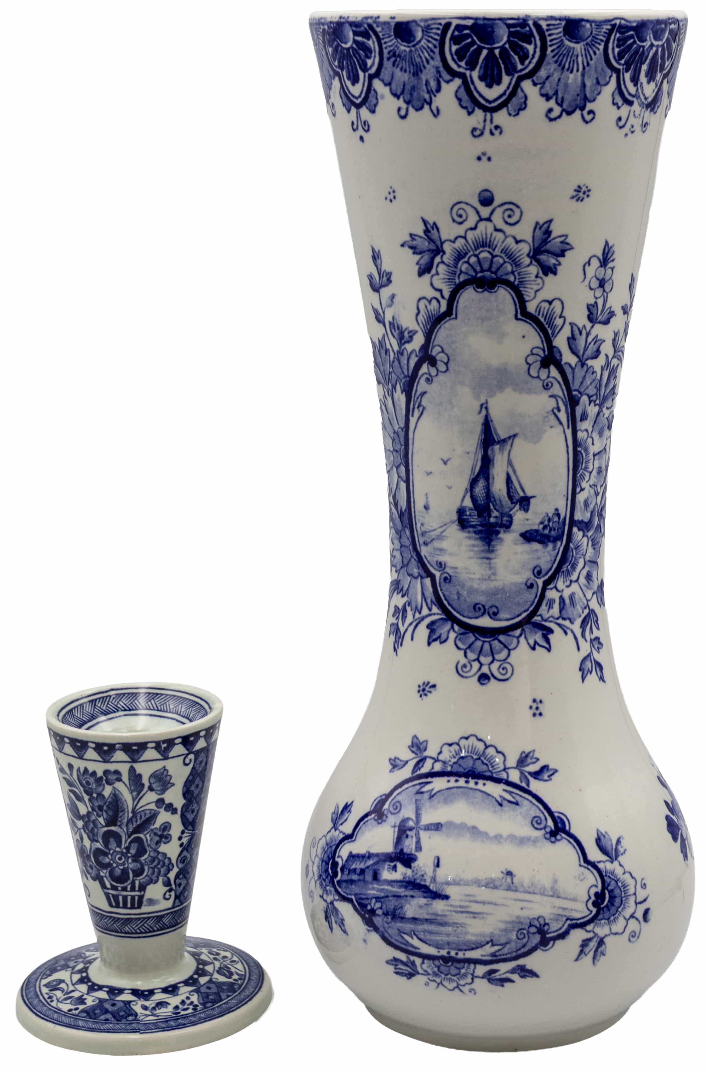 05.16 Vas pentru flori și suport lumânare, ceramică decorată cu cobalt, vasul marcat Delft, H 31.5/10cm, a II-a jum.sec.XX