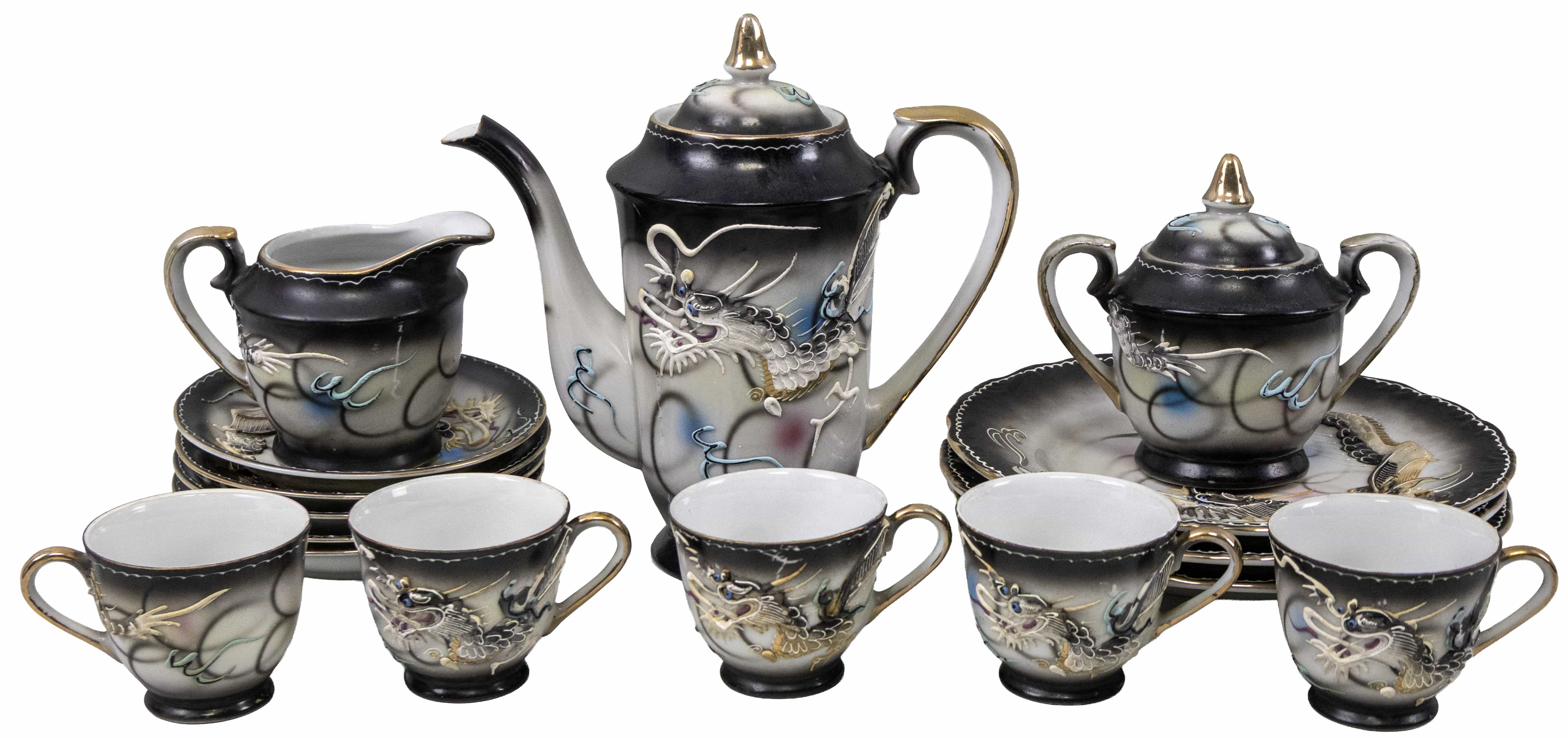 05.18 Cinci cești cu farfurii pentru ceai, trei farfurii pentru prăjituri, trei piese pentru servit, porțelan, aplicații de pastă pictată, decor cu aur, Extremul Orient, a II-a jum.sec.XX