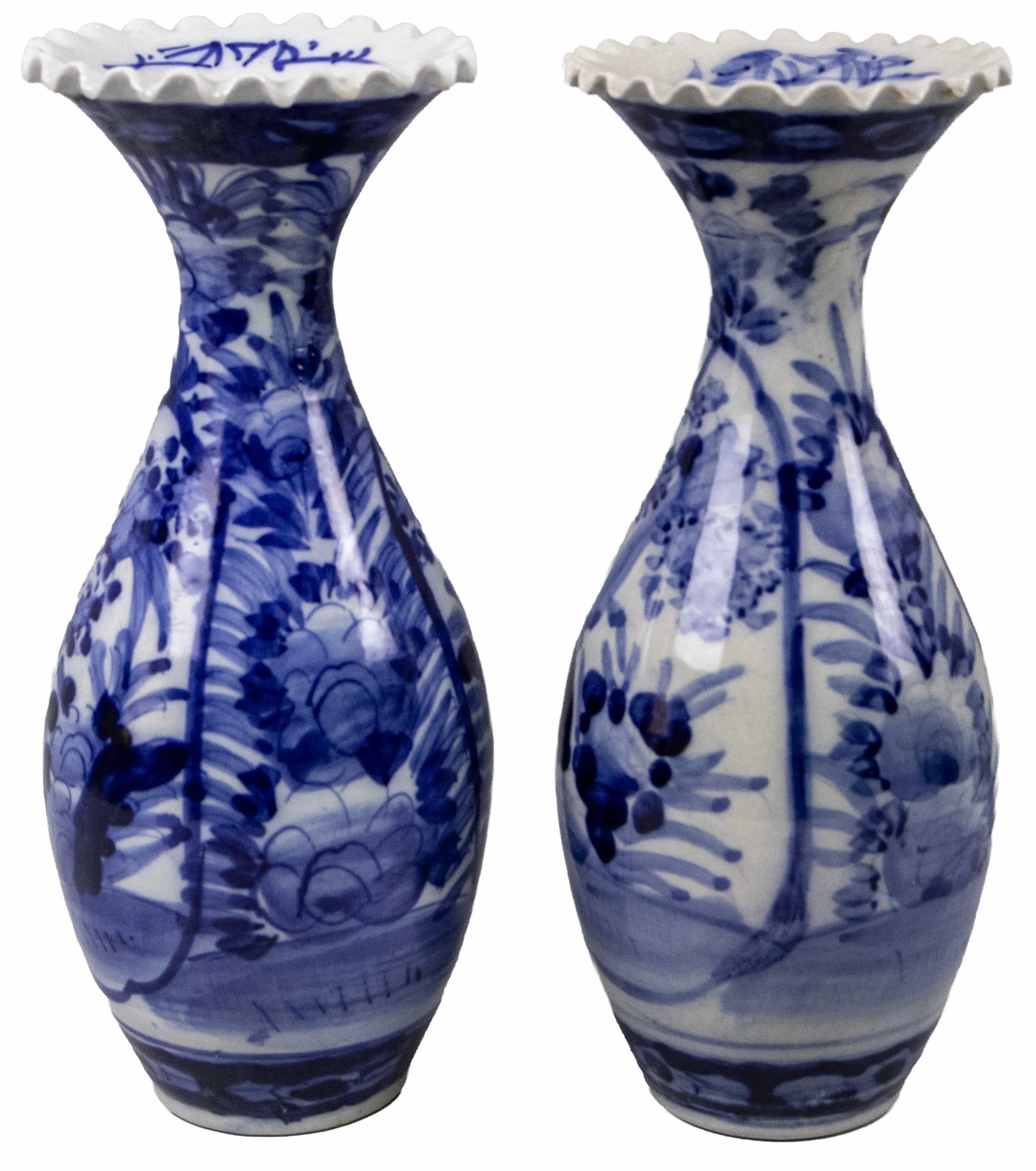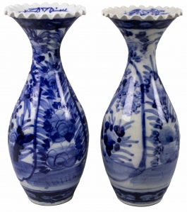 05.19 Pereche de vase ornamentale, bordură ondulată, ceramică pictată cu cobalt, H 25cm, a II-a jum.sec.XXX, un vas cu defecte