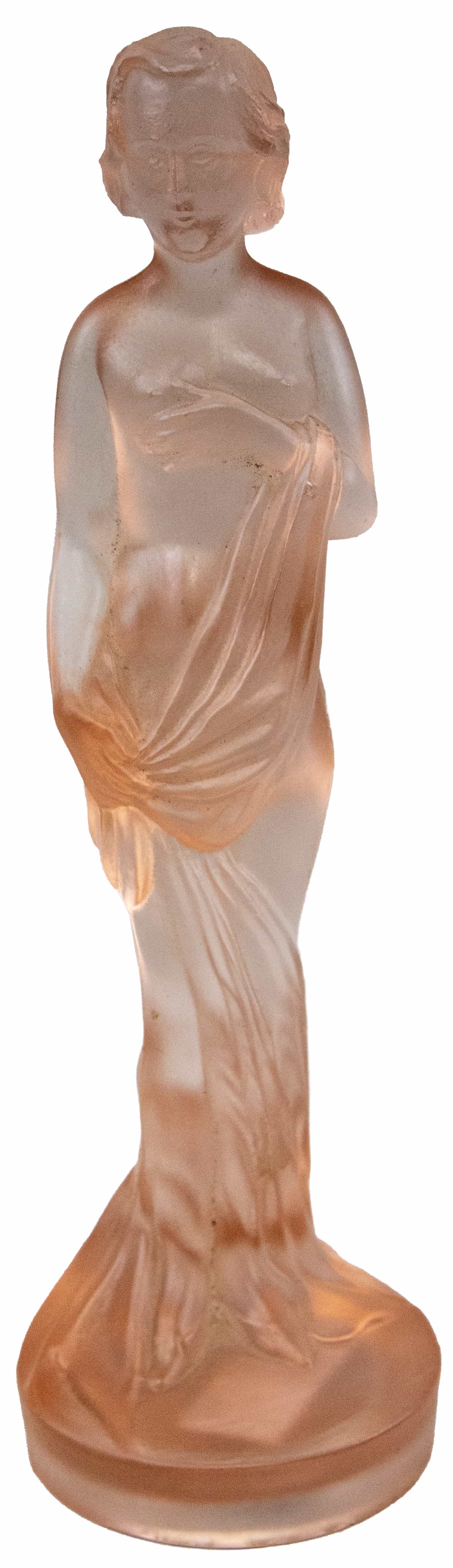 05.21 Nud drapat, piesă ornamentală, sticlă colorată (roz), H 20.5cm, perioada interbelică
