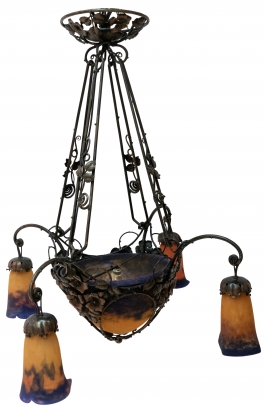 05.08 Plafonieră cu patru brațe, fier forjat, patru tulipe și dom central, semnate, modele și semnături diverse