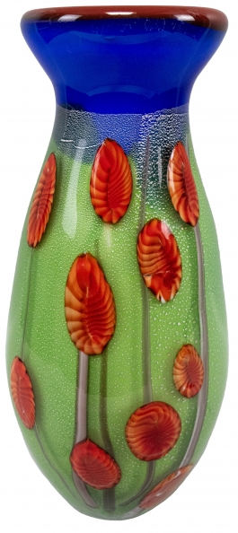 05.10 Vas ornamental, sticlă colorată cu aplicații de sticlă Murano, tulpini cu flori roșii, H 31.5cm