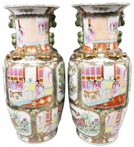 05.18 Pereche de vase ornamentale, porțelan pictat cu email și aur, decor cu flori și personaje, H 62cm, China, jum.sec.XX