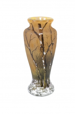 05.19 Vas ornamental, miniatural, sticlă colorată în masă, atacată cu acid, pictată cu email, decor de pădure, marcată Daum Nancy cu crucea de Lorena, H 8.7cm, înc.sec.XX