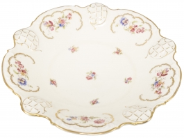 05.01 Fructieră pe picior, bordură lobată, porțelan decorat cu flori în relief și aur, elemente neorococo, marcată Rosenthal