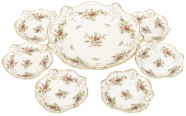 05.03 Bol și șase farfurii pentru alune, bordură lobată, porțelan traforat, decorat în relief cu flori și aur, marcate Rosenthal, elemente neorococo