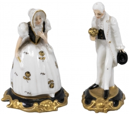 05.09 "La întâlnire", două piese miniaturale de vitrină, porțelan pictat cu cobalt și aur, marcate Rosenthal Selb-Bavaria, H 6cm, perioada interbelică