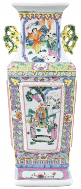 05.10 Vas ornamental cu anse, secțiune poligonală, porțelan pictat, tehnică Moriage, decor cu personaje și flori în medalioane, marcat, H 44cm, Japonia, perioada interbelică