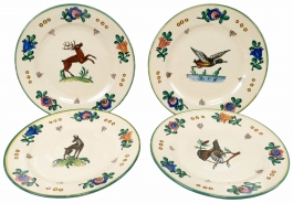 05.03 Patru farfurii, ceramică pictată cu scene cinegetice, marcate, dia. 24cm, perioada interbelică