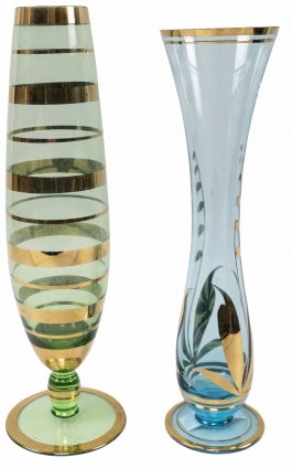 05.13 Două soliflore, sticlă colorată, decorată cu aur, H 22/23.5cm, jum.sec.XX