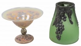 05.18 Vas ornamental și cupă, sticlă colorată cu aplicații metalice și sticlă pictată, semnată, H 14/11cm, a II-a jum.sec.XX