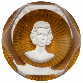05.05 Presse-papier, decorat cu medalionul Elisabetei a II-a, executat de John Pinches, marcat Baccarat-France, cristal gravat, fasetat, H 5cm, 1977