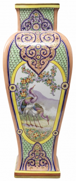05.17 Vas ornamental, secțiune pătrată, decor cu aur, porțelan pictat, marcat Samson, H 55cm, Franța, sf.sec.XIX