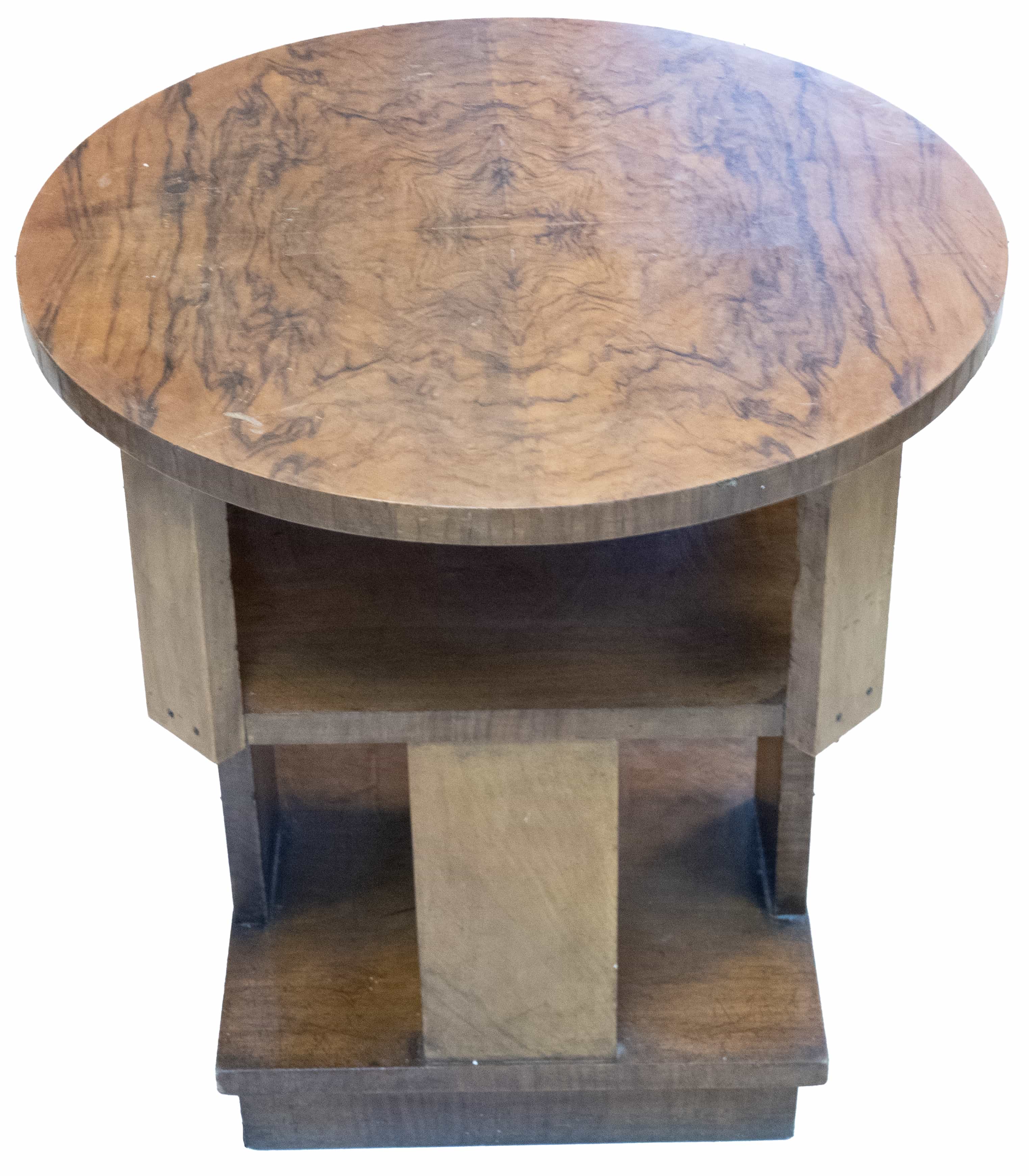 trei blaturi (unul rotund, două pătrate), lemn furniruit, Art Deco, dia. 63cm, H 65cm, perioada interbelică, restaurată