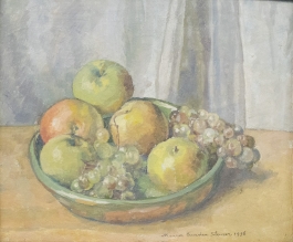 07.14 Maria Ciurdea Steurer (1878-1967) - "Natură statică cu mere si struguri", ulei pe carton, 32,5x39.5cm, semnat dreapta jos cu negru, datat 1936